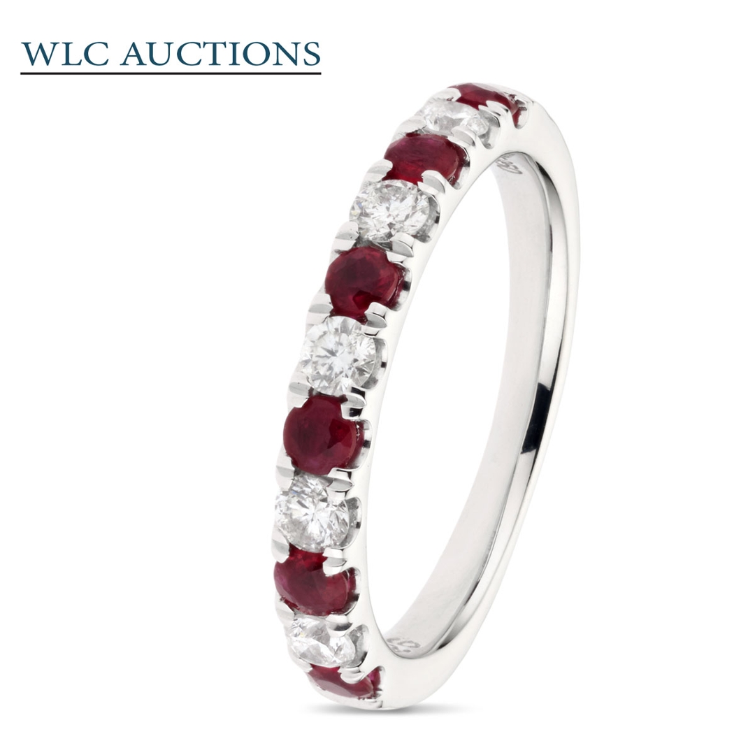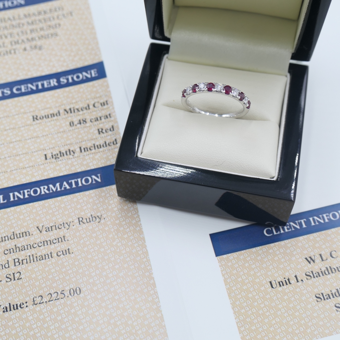 A brand-new, unused eternity ring crafted in certified platinum, this elegant piece is set with six round mixed-cut natural rubies and five brilliant-cut natural diamonds. The rubies, weighing a total of 0.48ct, display a deep, vibrant red tone that symbolises passion and strength, while the diamonds, weighing 0.30ct, are graded F–G in colour and SI1–SI2 in clarity, ensuring crisp brilliance that complements the richness of the rubies. The platinum band provides the perfect backdrop, enhancing both the colour and sparkle of the gemstones with its cool, refined finish.
