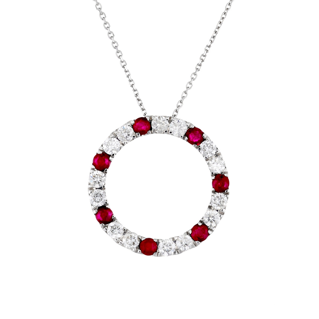 A brand-new, unused, certified natural diamond & ruby gemstone circle-shaped cluster pendant, with seven round mixed-cut ruby gemstones & a cluster of brilliant-cut diamonds, set in 18ct white gold.