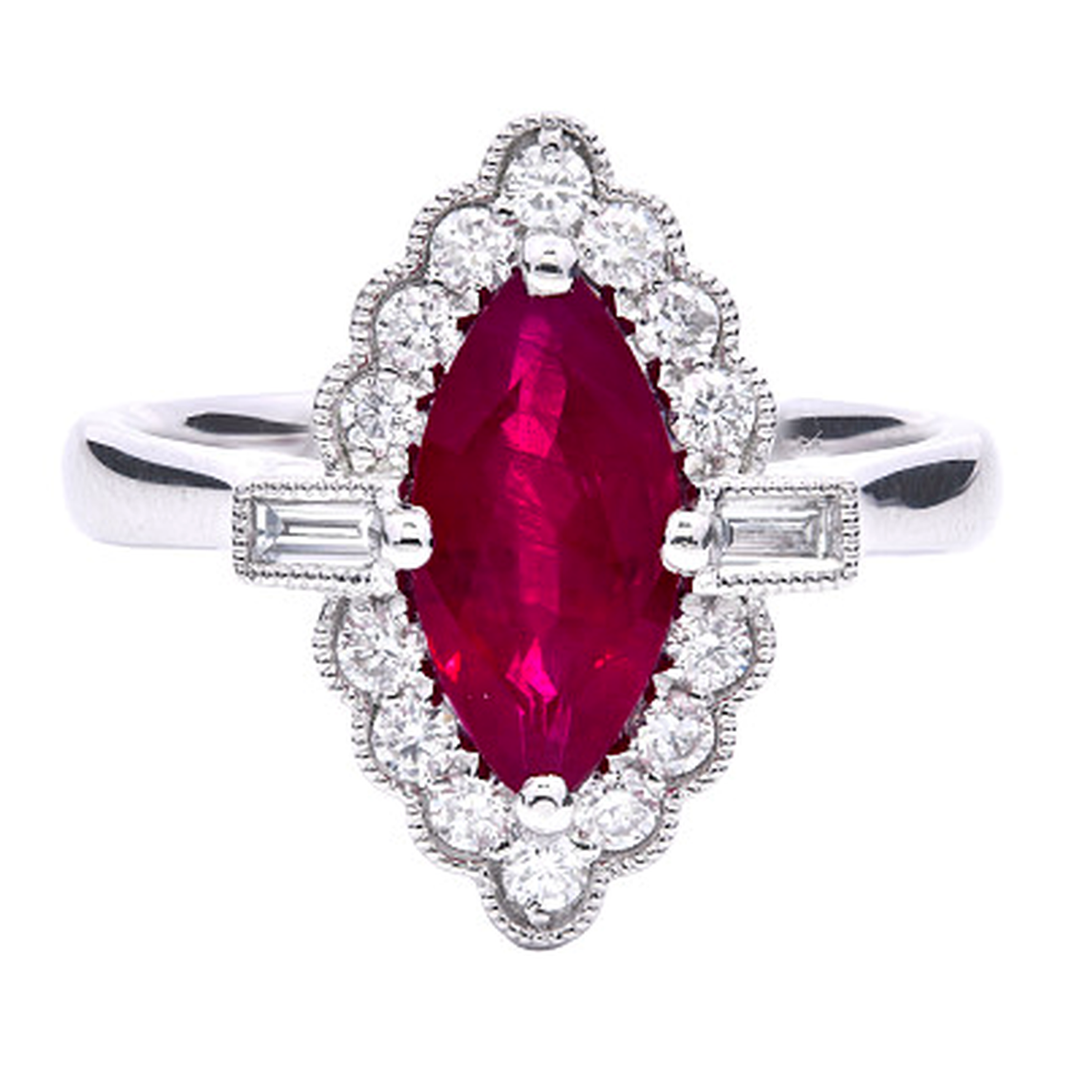 - > Natural Ruby 0.95ct & Diamond 0.23ct Marquise Shaped Cluster Ring