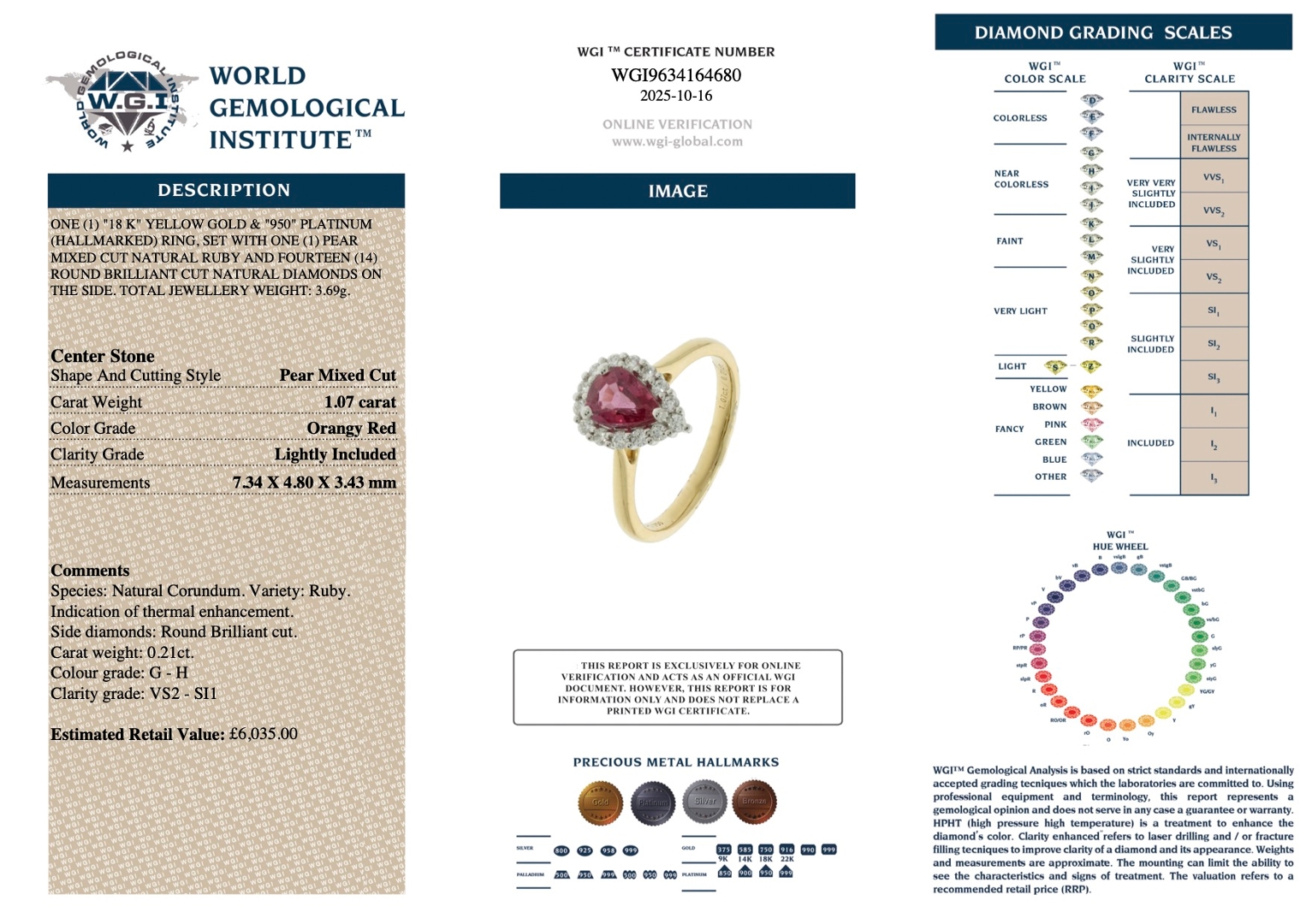 A brand-new, unused certified natural diamond and ruby cluster ring that captures timeless elegance and striking sophistication. At its centre lies a 1.07-carat pear-shaped mixed-cut ruby, displaying a rich orangy-red hue that radiates warmth, passion, and brilliance. Surrounding the central gemstone is a halo of brilliant-cut natural diamonds, adding an exceptional sparkle that enhances the ruby’s vivid colour. The diamonds, totalling 0.21 carats, are graded G–H in colour and VS2–SI1 in clarity, providing outstanding fire and clarity that perfectly complement the ruby’s vibrant tone.