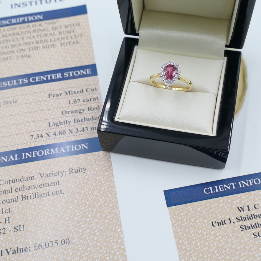 A brand-new, unused certified natural diamond and ruby cluster ring that captures timeless elegance and striking sophistication. At its centre lies a 1.07-carat pear-shaped mixed-cut ruby, displaying a rich orangy-red hue that radiates warmth, passion, and brilliance. Surrounding the central gemstone is a halo of brilliant-cut natural diamonds, adding an exceptional sparkle that enhances the ruby’s vivid colour. The diamonds, totalling 0.21 carats, are graded G–H in colour and VS2–SI1 in clarity, providing outstanding fire and clarity that perfectly complement the ruby’s vibrant tone.