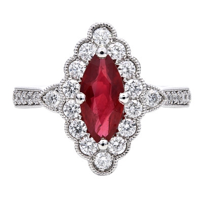 - > Natural Ruby 1.09ct & Diamond 0.57ct Marquise Shaped Cluster Ring
