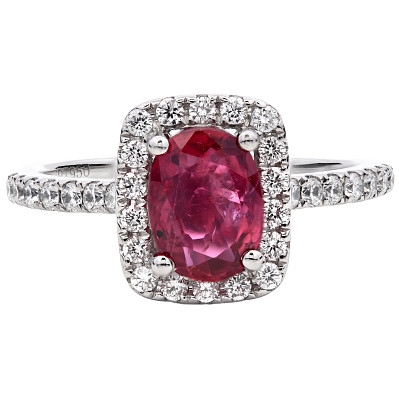 A brand-new, unused, certified natural diamond & ruby emerald-shaped cluster ring, with one oval-cut ruby gemstone at the centre & a cluster of brilliant-cut diamonds in a halo setting & to the shoulders, set in platinum.