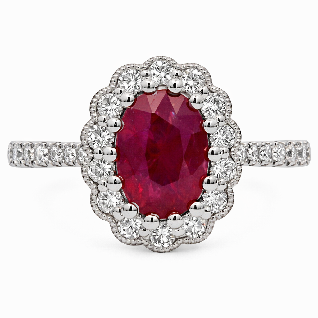 A brand-new, unused certified natural diamond and ruby flower-shaped cluster ring, set with a richly coloured 1.59ct oval-cut ruby at its centre, encircled by a radiant halo of brilliant-cut diamonds with additional diamonds extending gracefully along the shoulders, all expertly crafted in platinum. The floral-inspired design brings a sense of elegance and femininity, while the vivid ruby creates a striking focal point that draws the eye with its depth and warmth.