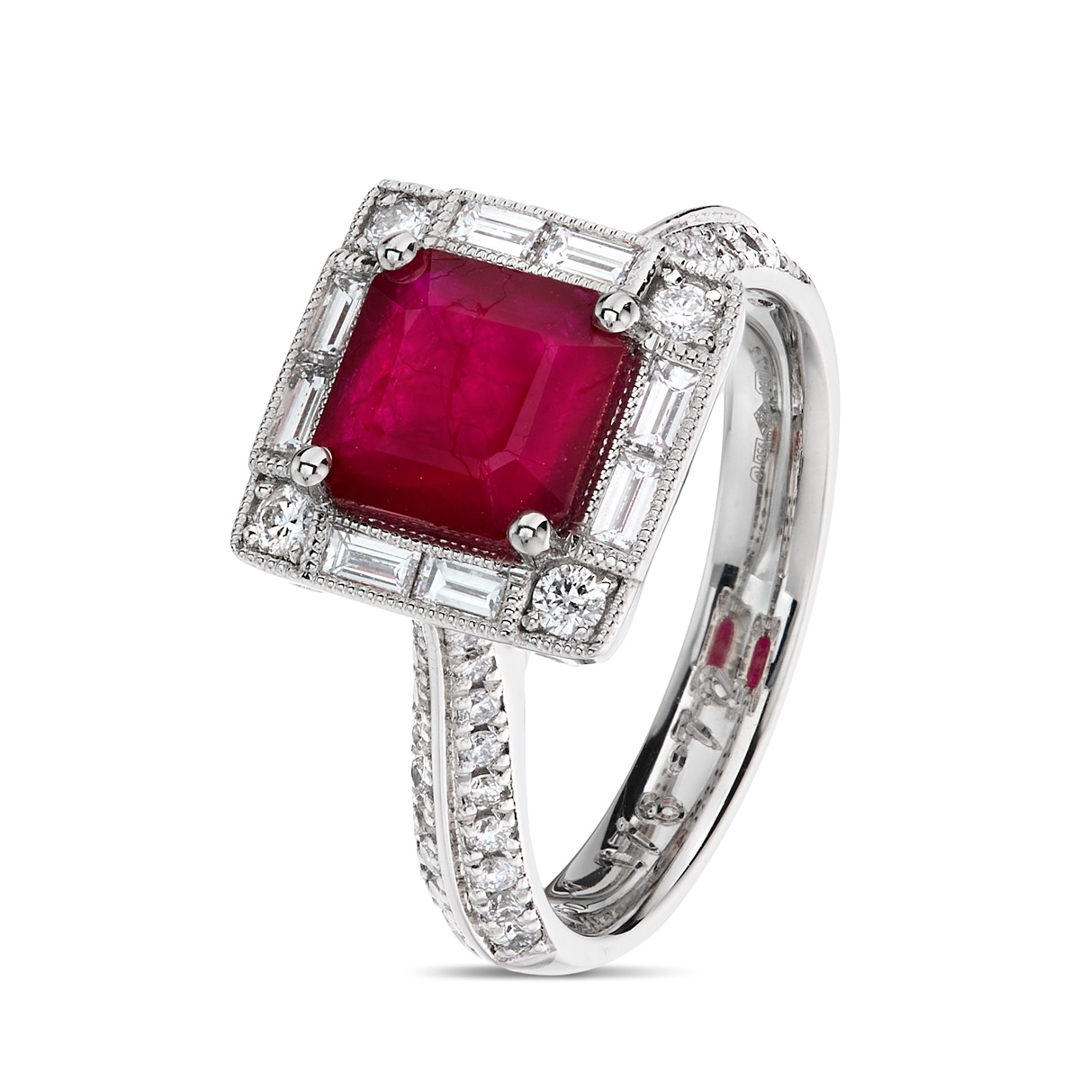 A brand-new, unused, certified natural diamond & ruby gemstone princess-shaped cluster ring, with one octagonal step-cut ruby gemstone to the centre & a cluster of baguette cut & brilliant cut diamonds in a halo setting & a cluster of brilliant cut diamonds to the shoulders, set in platinum.