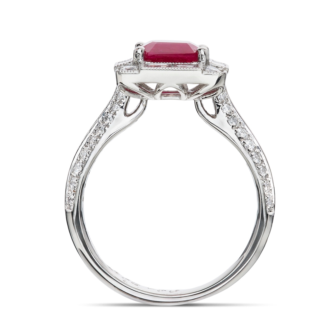 A brand-new, unused certified natural diamond and ruby cluster ring that exudes sophistication, brilliance, and timeless appeal. At its centre lies a 1.78-carat octagonal step-cut ruby, displaying an intense, captivating red hue that symbolises passion and prestige. Surrounding the central gemstone is an elegant halo of baguette-cut and brilliant-cut natural diamonds, with additional clusters of brilliant-cut diamonds set along the shoulders to enhance its radiant sparkle. The diamonds, totalling 0.72 carats, are graded F–G in colour and VS1–VS2 in clarity, offering superior brilliance, purity, and light performance that beautifully complement the ruby’s rich tone.