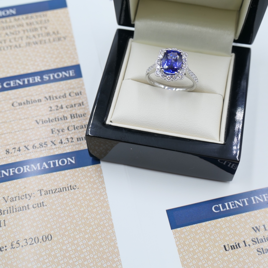 A brand-new, unused certified natural diamond and tanzanite cluster ring that radiates captivating beauty and refined craftsmanship. At its centre rests a stunning 2.24-carat cushion mixed-cut tanzanite, displaying a mesmerising violetish-blue hue that shifts elegantly with the light. Surrounding this exceptional gemstone is a flower-shaped halo of brilliant-cut natural diamonds that delicately continue along the shoulders, creating a dazzling display of brilliance and fire. With a total diamond weight of 0.62 carats, graded F–G in colour and VS2–SI1 in clarity, the diamonds bring exceptional sparkle and purity that perfectly complement the tanzanite’s rich, exotic tone.