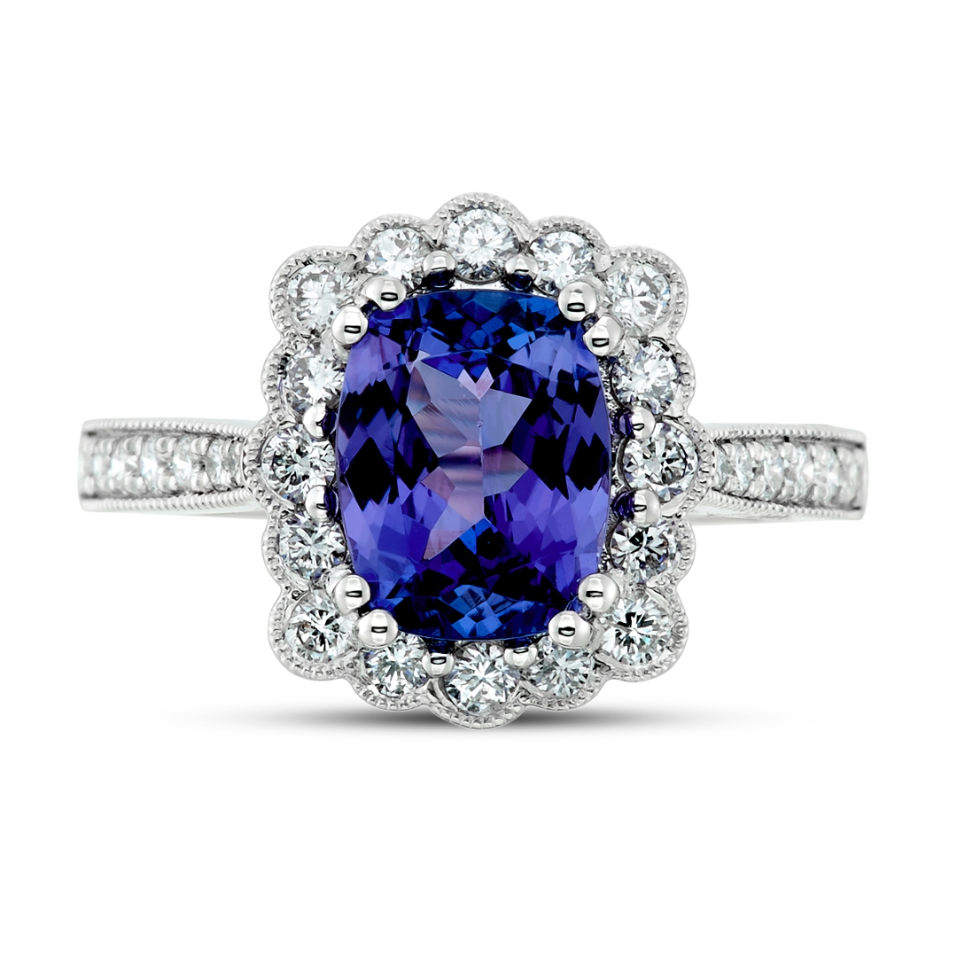 A brand-new, unused, certified natural diamond & tanzanite flower-shaped cluster ring, with one cushion mixed-cut tanzanite gemstone to the centre & a cluster of brilliant-cut diamonds in a halo setting & to the shoulders, set in platinum.