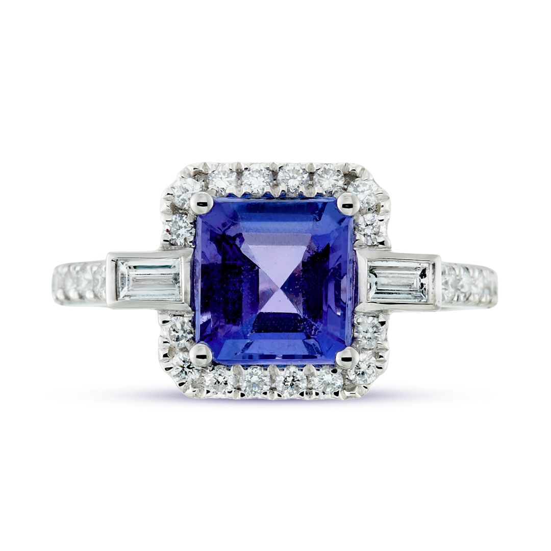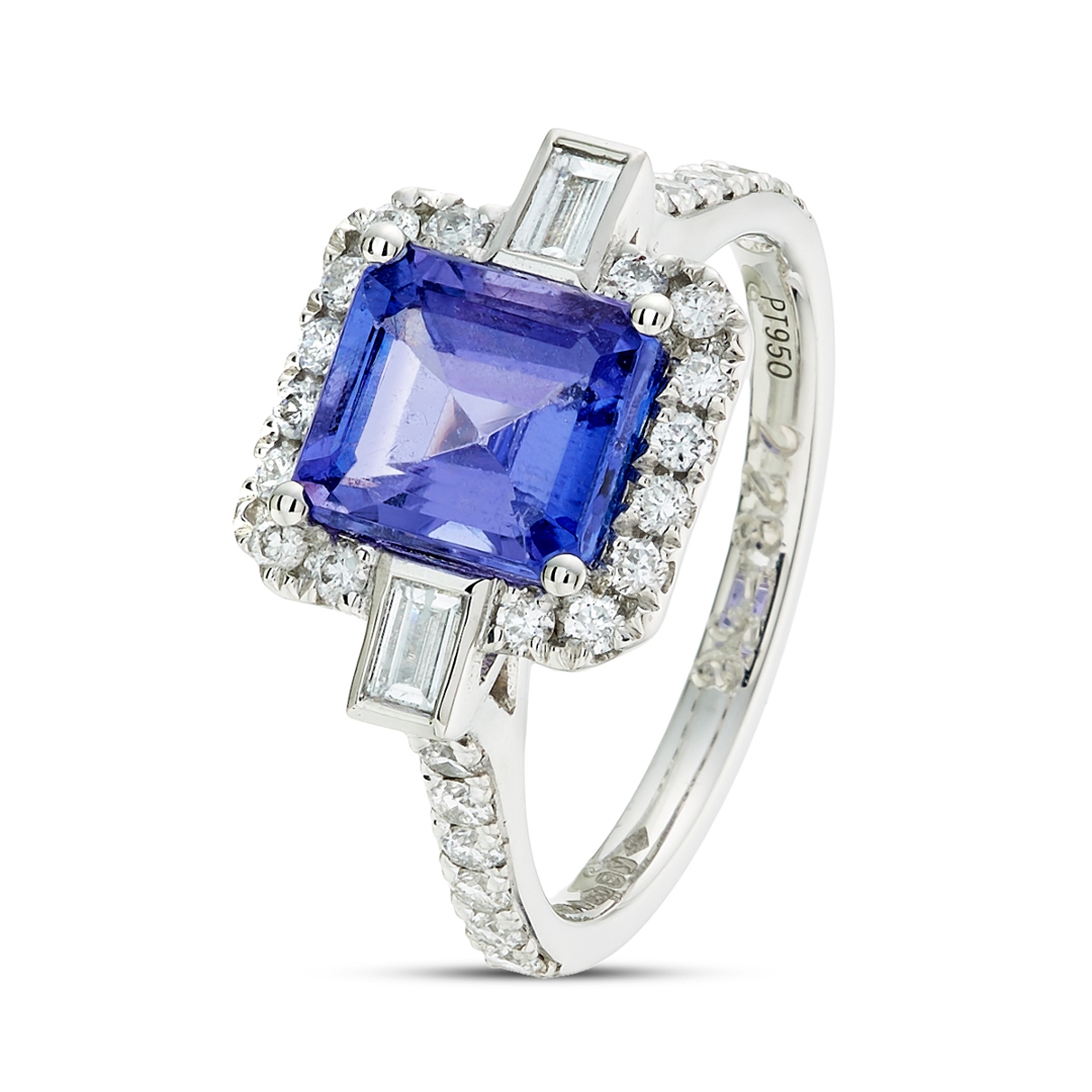 A brand-new, unused, certified natural diamond & tanzanite cushion-shaped cluster ring, with one octagonal step-cut tanzanite gemstone to the centre, two baguette-cut diamonds to the sides & a cluster of brilliant-cut diamonds in a halo setting & to the shoulders, set in platinum.