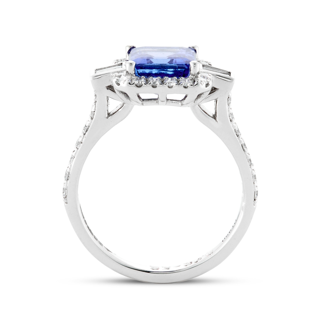 A brand-new, unused, certified natural diamond and tanzanite cluster ring that radiates opulence and refined sophistication. At its centre lies a striking 2.28-carat octagonal step-cut tanzanite, displaying a mesmerising purplish-blue hue that shifts beautifully under the light. Flanking the central gemstone are two baguette-cut diamonds, adding a touch of structure and symmetry to the design. Surrounding the tanzanite is a halo of brilliant-cut natural diamonds that extend gracefully along the shoulders, enhancing the ring’s brilliance and presence. With a total diamond weight of 0.58 carats, graded G–H in colour and SI2 in clarity, the diamonds add exceptional sparkle and balance to the tanzanite's vivid tone.