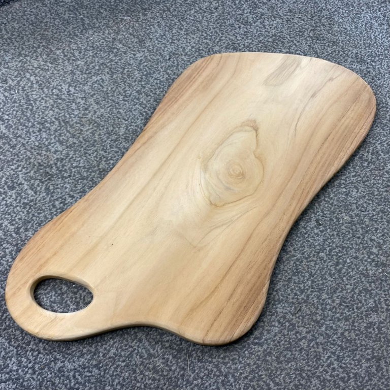 A natural Teak wooden chopping board with a handle. Approx 25" height, 12" width.