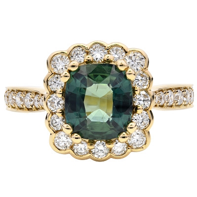 A brand-new, unused, certified natural diamond & teal sapphire gemstone flower-shaped cluster ring, set with one cushion-cut teal sapphire gemstone at the centre & a cluster of brilliant-cut diamonds in a halo setting & to the shoulders, set in 18ct yellow gold.