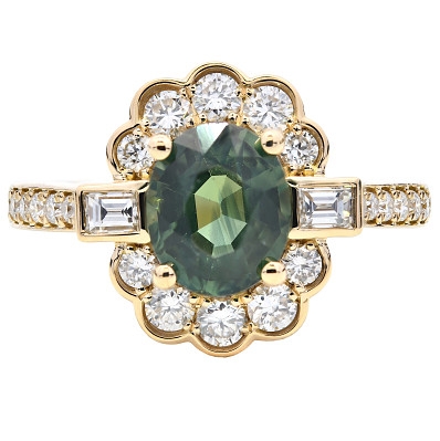A brand-new, unused, certified natural diamond & teal sapphire flower-shaped cluster ring, with one oval-cut teal sapphire gemstone at the centre, two baguette-cut diamonds to the sides & a cluster of brilliant-cut diamonds in a halo setting & to the shoulders, set in 18ct yellow gold.