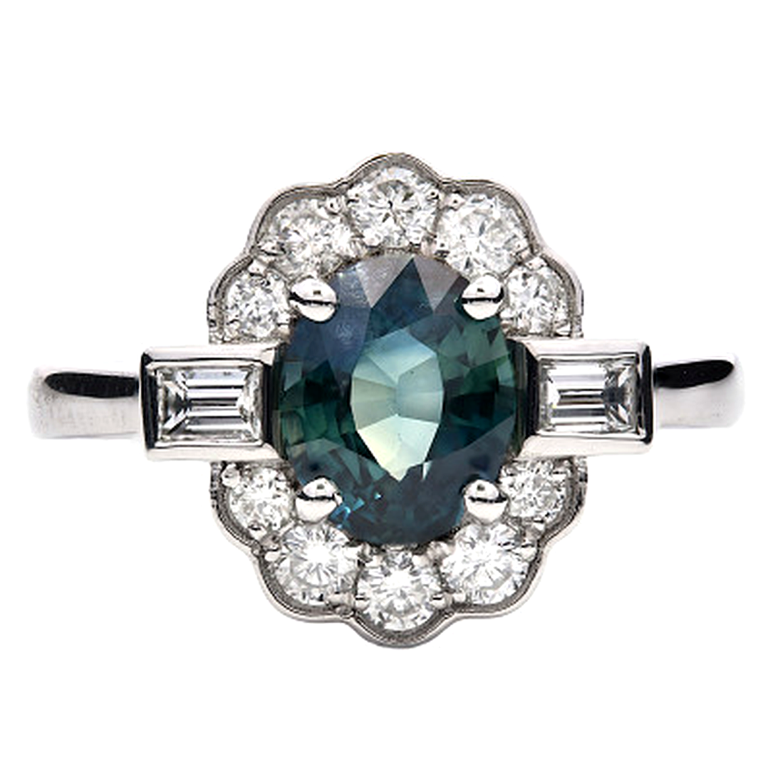 A brand-new, unused, certified natural diamond & teal sapphire flower-shaped cluster ring, with one oval-cut teal sapphire gemstone at the centre, two baguette-cut diamonds to the sides & a cluster of brilliant-cut diamonds in a halo setting, set in platinum.