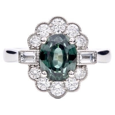 A brand-new, unused certified natural teal sapphire and diamond flower-shaped cluster ring featuring a 2.10ct oval-cut teal sapphire at the centre, framed by two baguette-cut diamonds and a halo of brilliant-cut diamonds, all set in platinum. The teal sapphire presents a captivating blend of blue and green tones, offering a distinctive depth of colour that sets it apart from more traditional gemstones. Its richness is enhanced by the crisp sparkle of the natural diamonds, whose 0.53ct combined weight introduces both structured flashes from the baguette cuts and lively scintillation from the surrounding brilliant cuts. Natural diamonds continue to be admired for their rarity, authenticity and enduring brilliance, and their presence in this design adds contrast and refinement while elevating the sapphire’s unique character.
