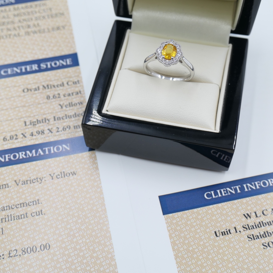 With a professional valuation of £2,800, this certified 18ct white gold, yellow sapphire and diamond cluster ring offers both beauty and enduring investment potential. Natural diamonds remain highly prized for their rarity and lasting worth, making this piece an exquisite expression of sophistication, craftsmanship, and timeless value.