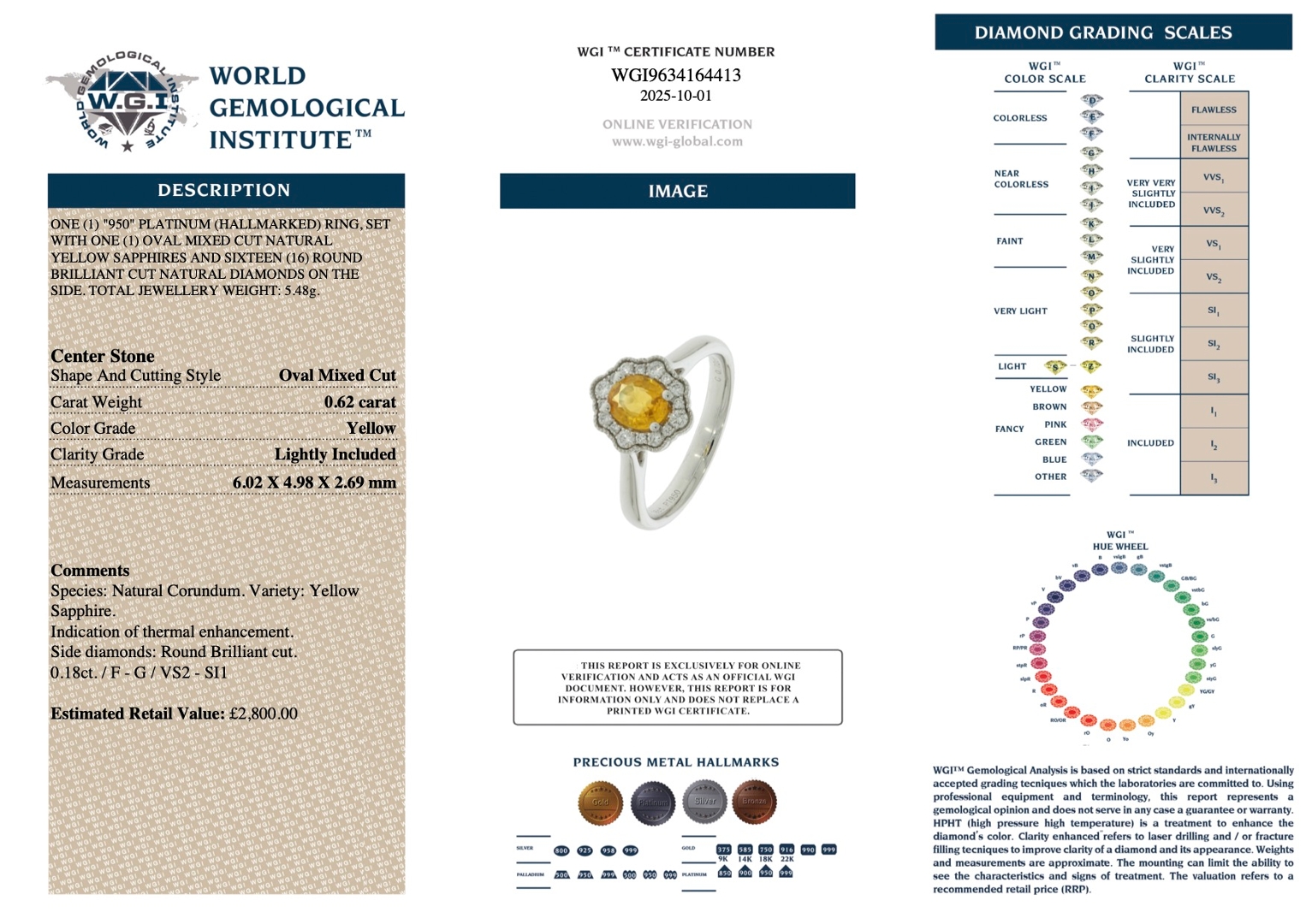 A brand-new, unused, certified natural diamond & yellow sapphire gemstone flower-shaped cluster ring, with one oval mixed-cut yellow sapphire gemstone to the centre & a cluster of brilliant cut diamonds in a halo setting, set in platinum.
