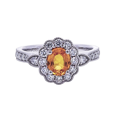 A brand-new, unused certified platinum ring featuring a captivating 0.70ct oval-cut yellow sapphire gemstone at its centre, glowing with a vibrant golden hue that radiates warmth and elegance. The gemstone is encircled by a delicate cluster of natural brilliant-cut diamonds arranged in a flower-shaped halo, with additional diamonds adorning the shoulders, totalling 0.50ct. The striking contrast between the vivid sapphire and the diamonds' icy sparkle creates a luxurious balance, while the platinum setting adds strength, purity, and timeless sophistication to the piece.