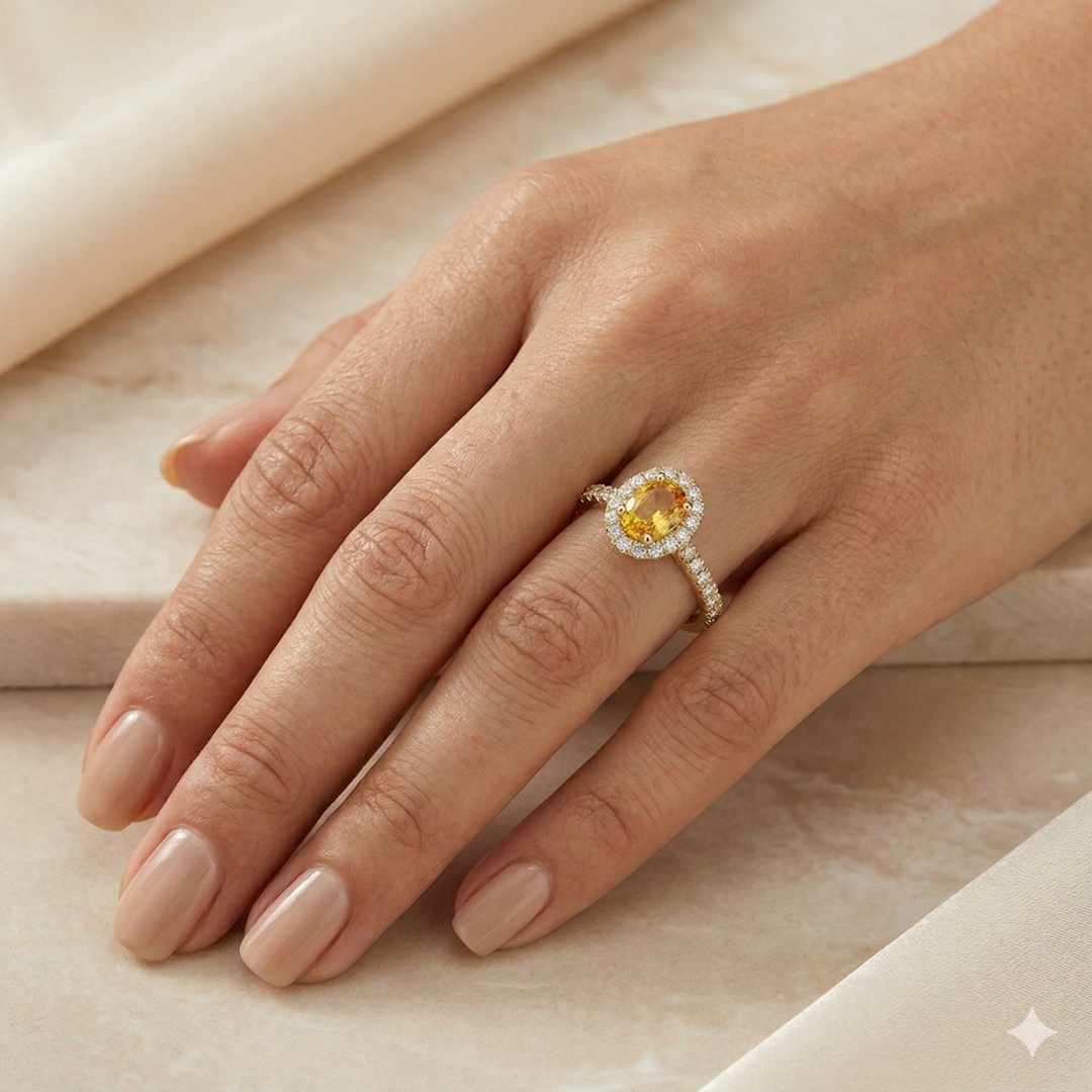 A brand-new, unused certified natural diamond and yellow sapphire cluster ring that radiates warmth, brilliance, and refined luxury. At its centre rests a 1.36-carat oval mixed-cut yellow sapphire, displaying a vibrant orangy-yellow hue that glows with rich, sunlit intensity. Surrounding the gemstone is a halo of brilliant-cut natural diamonds that gracefully extends along the shoulders, creating a stunning play of light and sparkle. With a total diamond weight of 0.54 carats, graded G–H in colour and SI1–SI2 in clarity, the diamonds provide dazzling contrast and purity, enhancing the sapphire’s vivid tones beautifully.