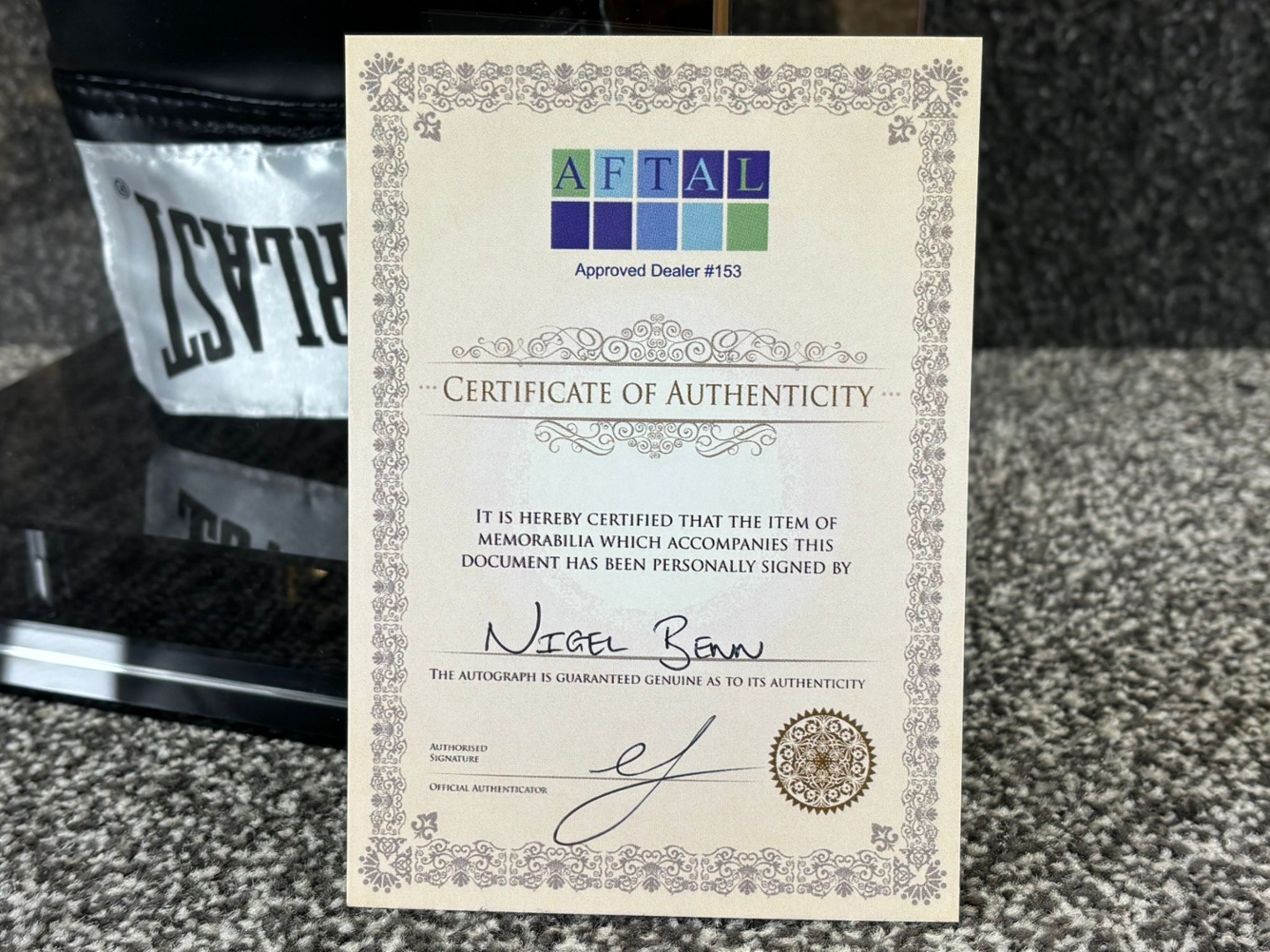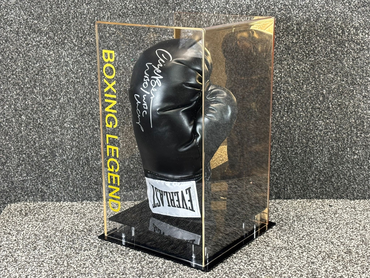 The authentication ensures the signature's legitimacy, adding value for collectors and boxing enthusiasts alike. This piece serves as a timeless reminder of Benn's legacy, making it an ideal centrepiece for any sports memorabilia collection. Whether you're a long-time fan or new to the sport, this signed glove is a significant piece of boxing history.