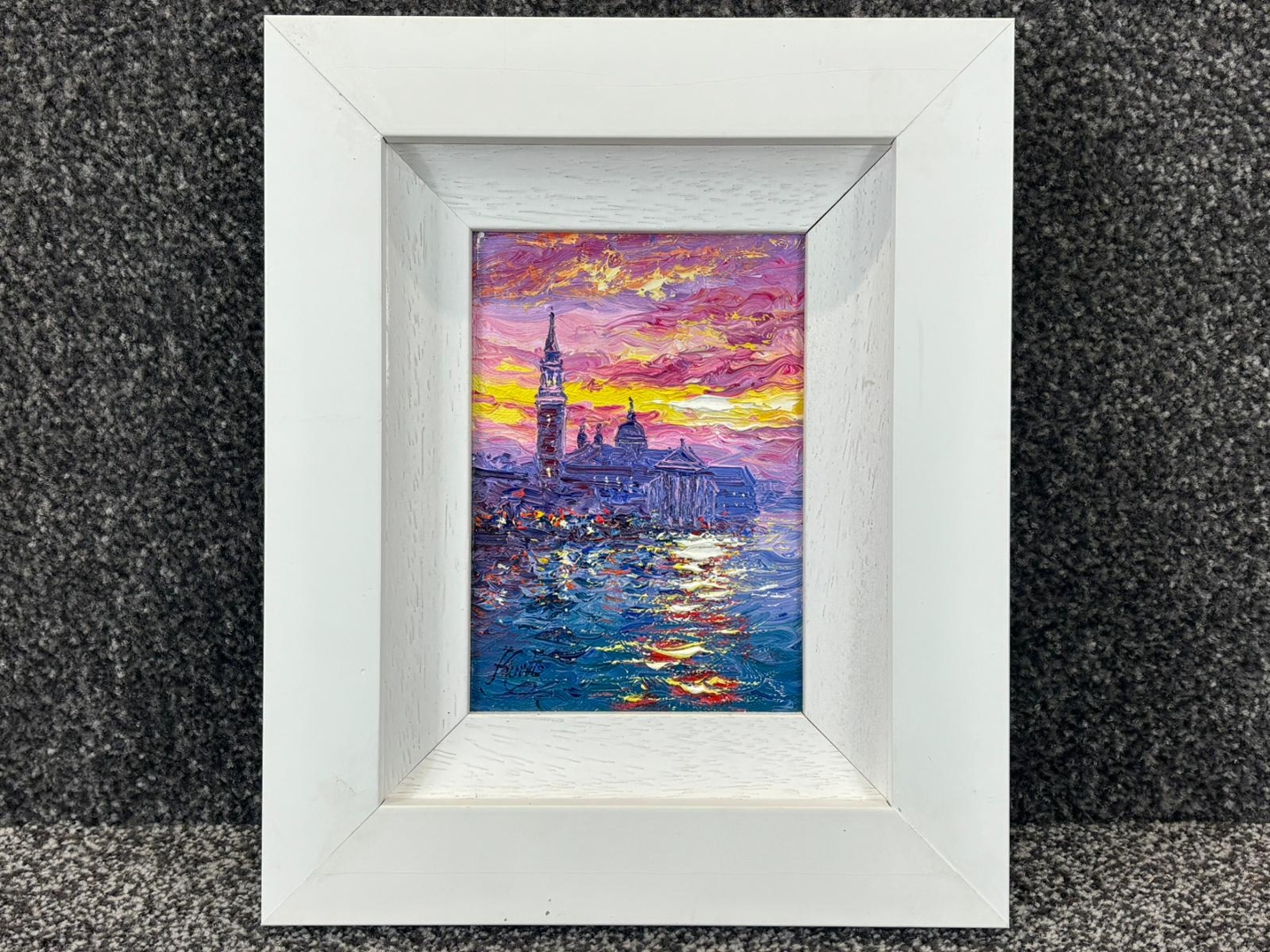 A bold and energetic use of colour defines the piece, with thick impasto brushwork bringing the sky to life in vivid tones of pink, purple, and glowing gold. The reflections shimmer across the water in dynamic strokes, creating movement and depth, while the elegant silhouette of San Giorgio Maggiore anchors the composition with balance and clarity. The interplay of light and texture gives the painting a striking visual presence.