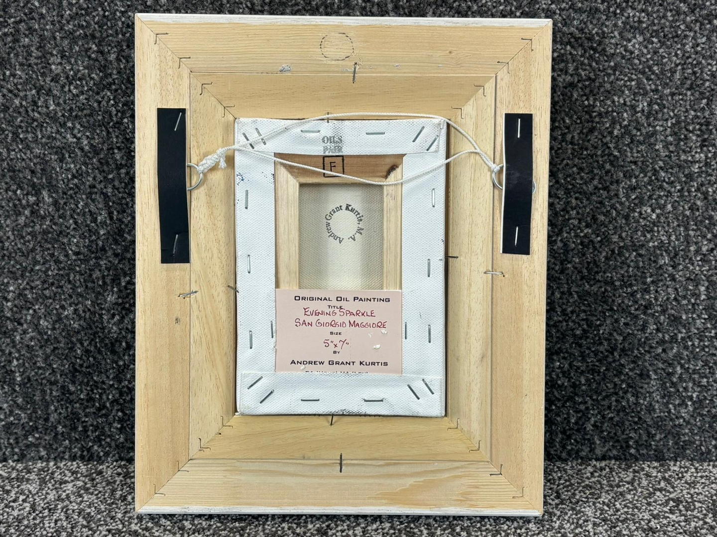 A framed original oil painting by Andrew Grant Kurtis titled 'Evening Sparkle San Giorgio Maggiore'. Approx 7" height, 5" width.