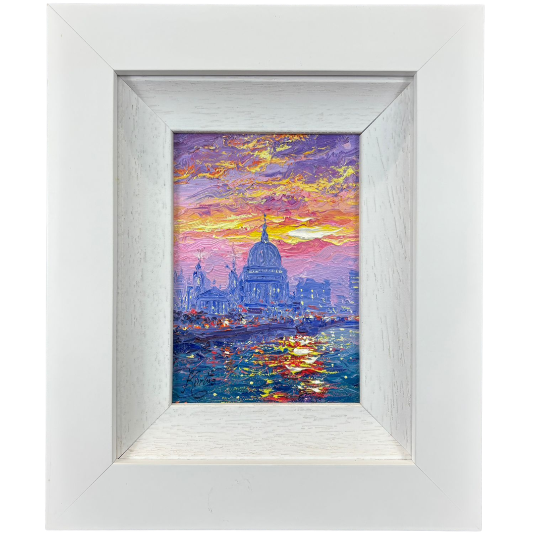 A framed original oil painting by Andrew Grant Kurtis titled 'Evening Sparkle St Paul's'. Approx 7" height, 5" width.