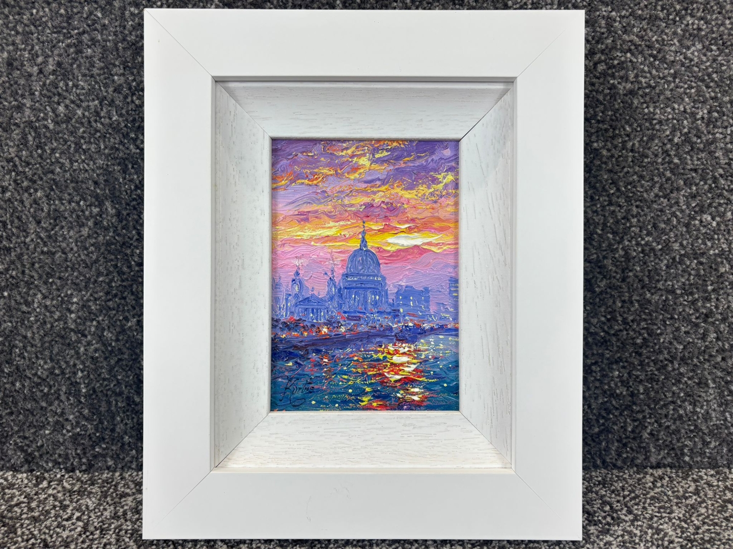 A dynamic interplay of colour defines the scene, with bold impasto brushwork bringing the sky to life in radiant hues of purple, pink, and gold. The shimmering reflections across the water echo these tones, creating depth and movement, while the cathedral’s silhouette stands with quiet authority at the centre. The balance between structure and abstraction gives the piece both energy and sophistication.
