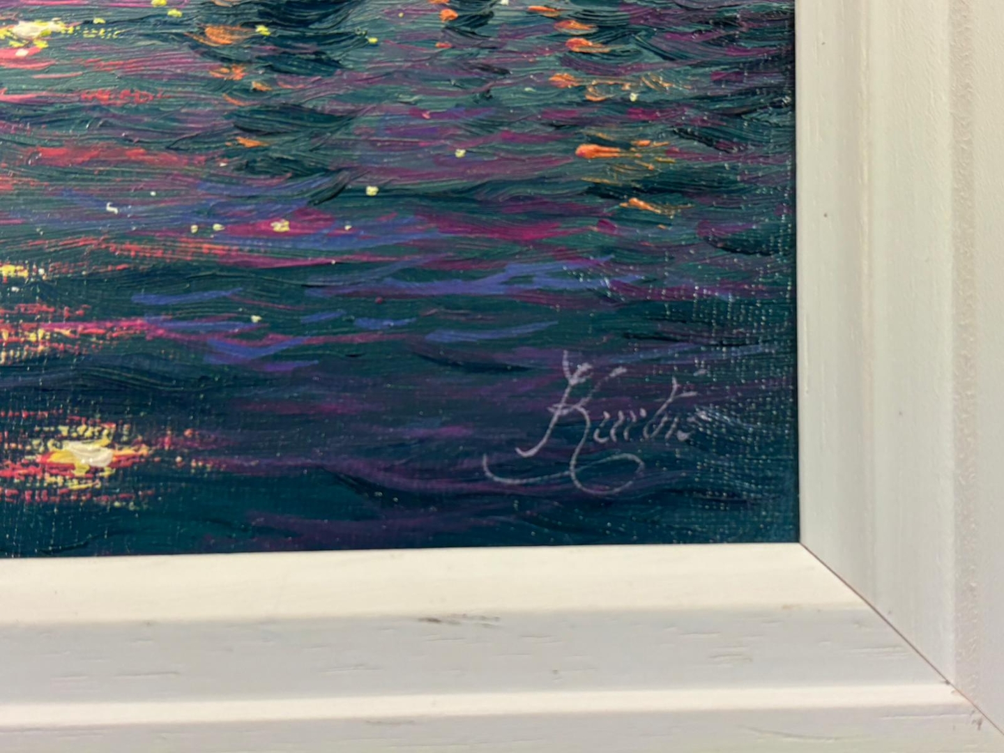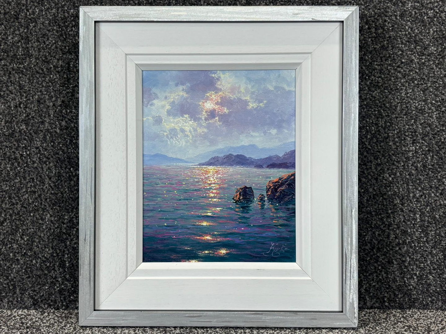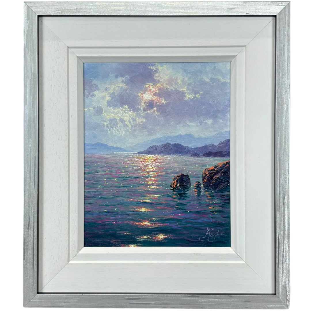 A rich interplay of colour and reflection defines the composition, with shimmering highlights stretching across the water’s surface in tones of gold, pink, and blue. The distant hills and softly textured sky create depth and balance, while the foreground rocks add structure and contrast. His expressive yet controlled brushwork brings a sense of movement and luminosity to the scene.