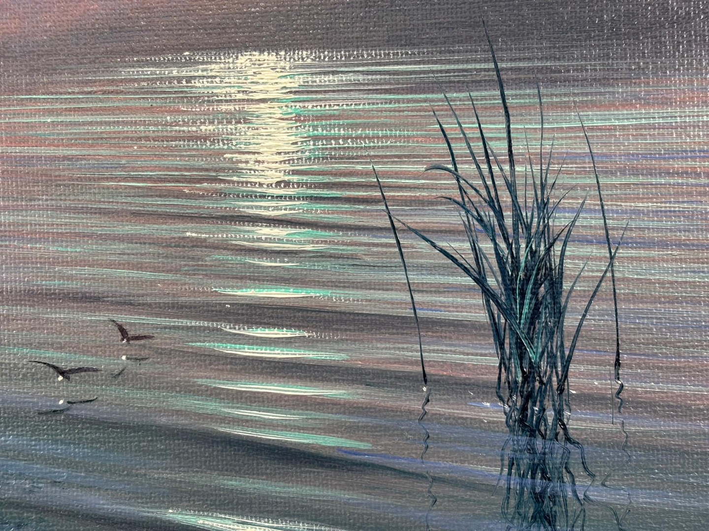 A subtle and harmonious palette of silvery blues and muted greys defines the piece, with gentle ripples carrying the moon’s reflection across the water. The inclusion of delicate reeds and distant landforms adds depth and balance, while the soft gradation of sky and water creates a calming, almost ethereal quality. His restrained brushwork enhances the sense of stillness and quiet movement.