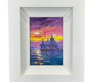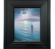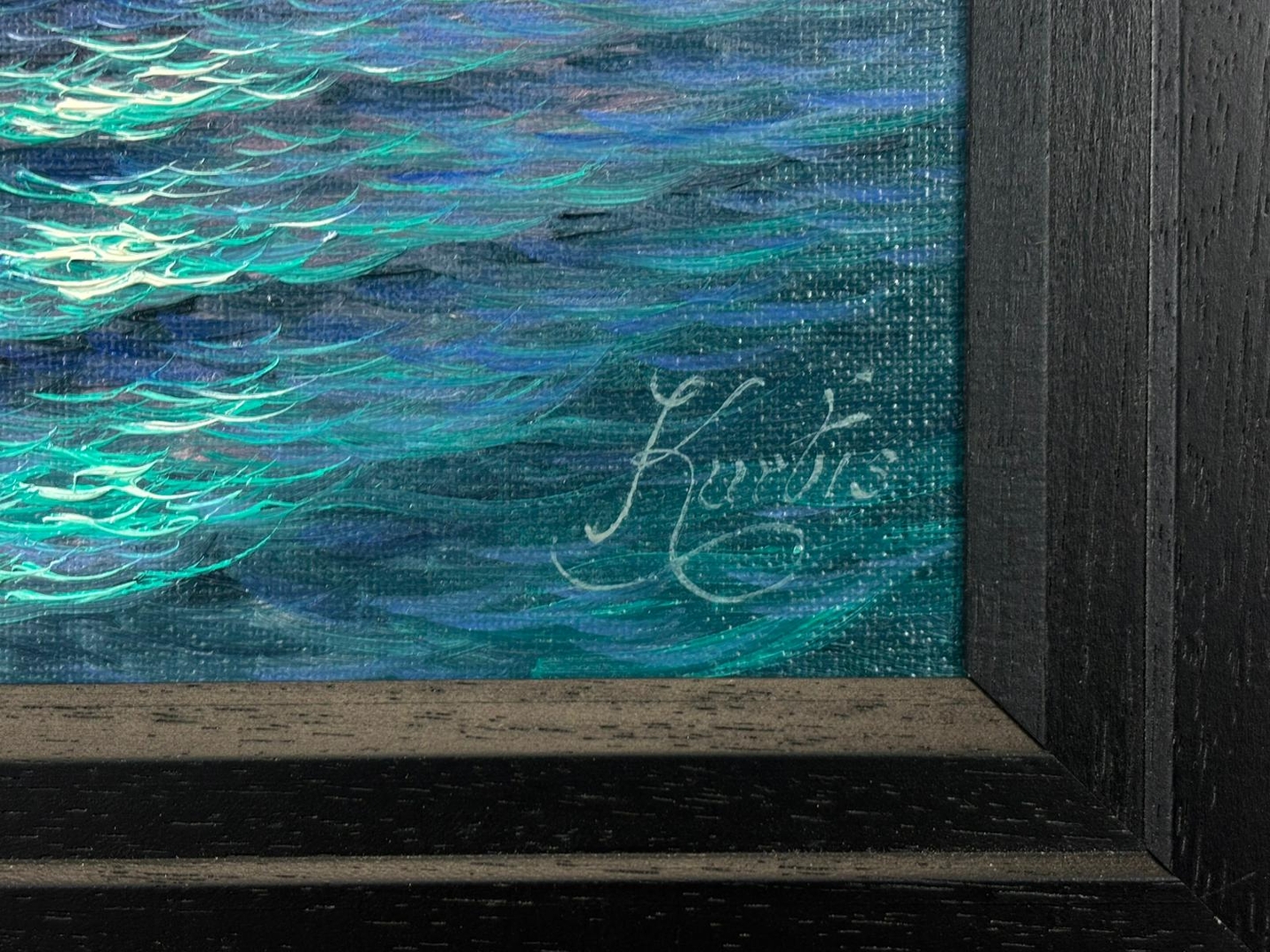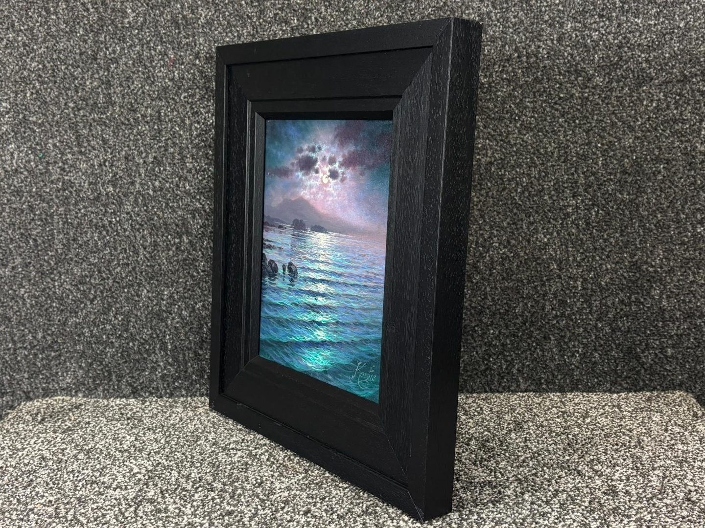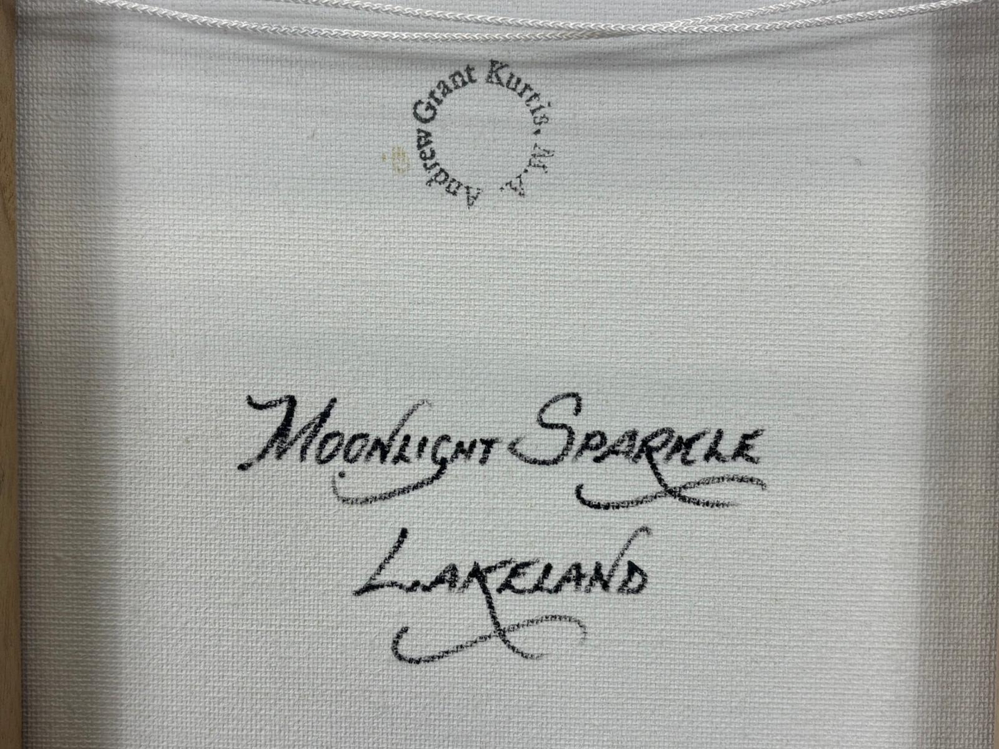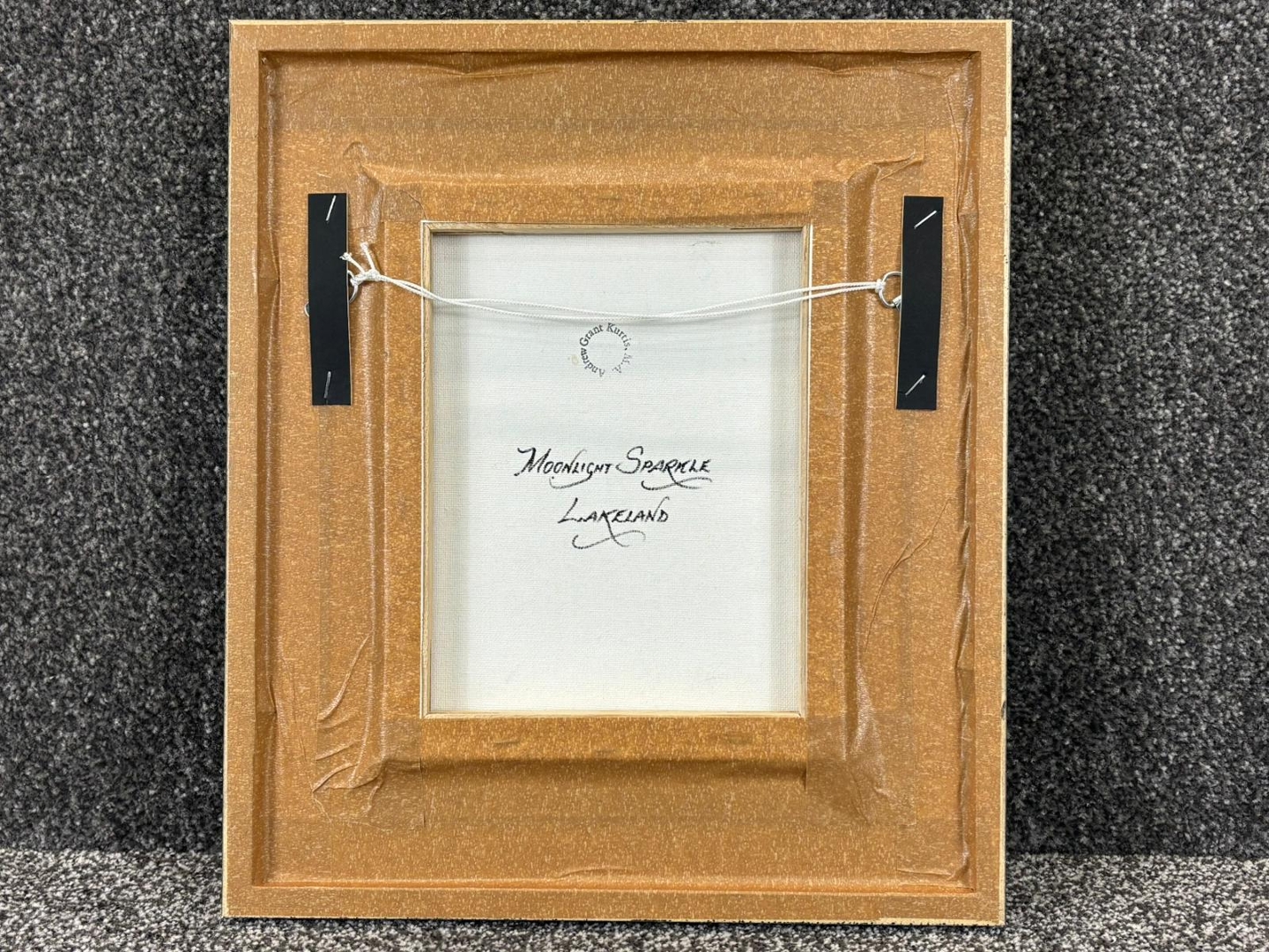 A framed original oil painting by Andrew Grant Kurtis titled 'Moonlight Sparkle Lakeland'. Approx 10" height, 8" width.