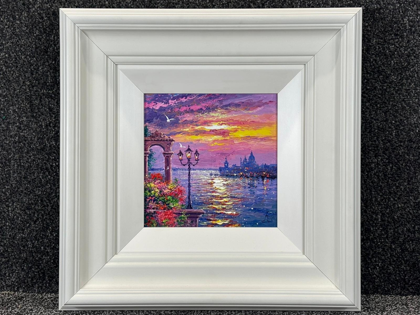 A vibrant framed original oil painting by Andrew Grant Kurtis titled ‘Reflections of Santa Maria Della Salute’, capturing the beauty of Venice at sunset with the iconic basilica set against a richly coloured sky. A London-born artist trained at the City and Guilds of London Institute, Kurtis is renowned for his mastery of atmospheric perspective and his expressive interpretation of light.
