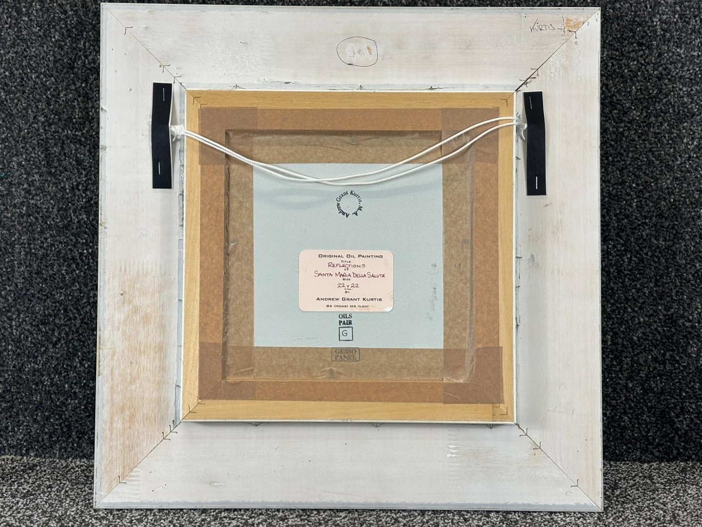 A framed original oil painting by Andrew Grant Kurtis titled 'Reflections of Santa Maria Della Salute'. Approx 9" height, 9" width.