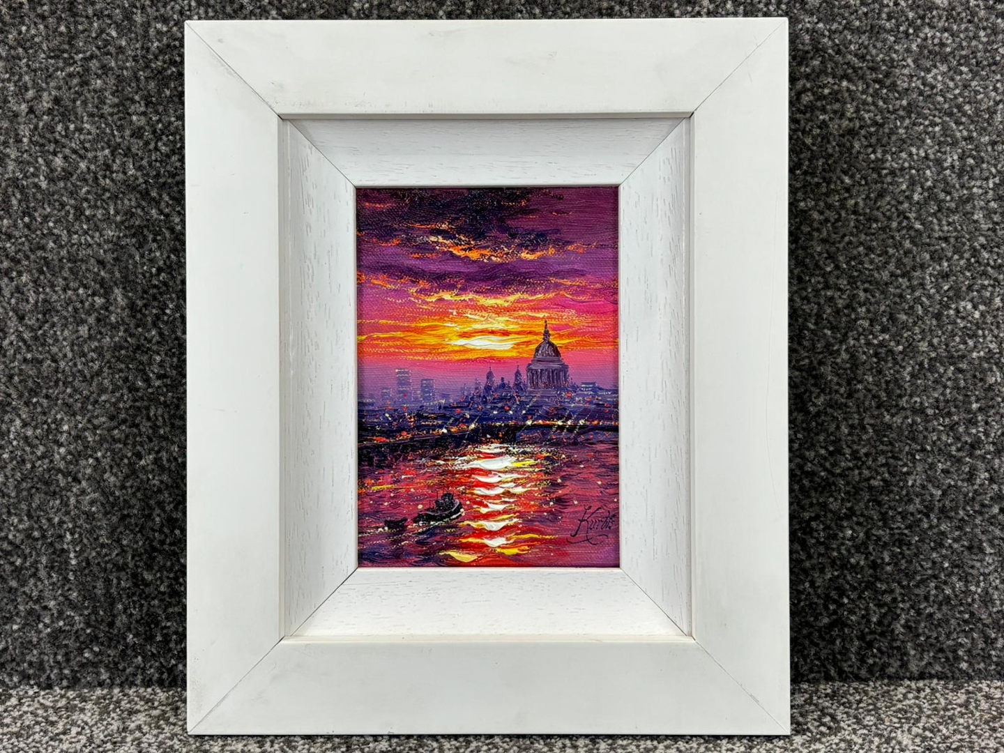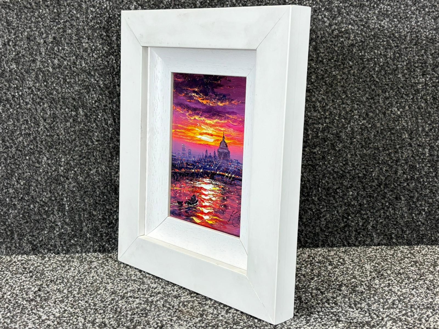A compact yet striking artwork measuring approximately 7 inches in height and 5 inches in width, presented in a clean, contemporary frame that complements its vivid palette. A highly decorative and collectible piece, ideal for admirers of London scenes and Kurtis’ distinctive, light-driven style.