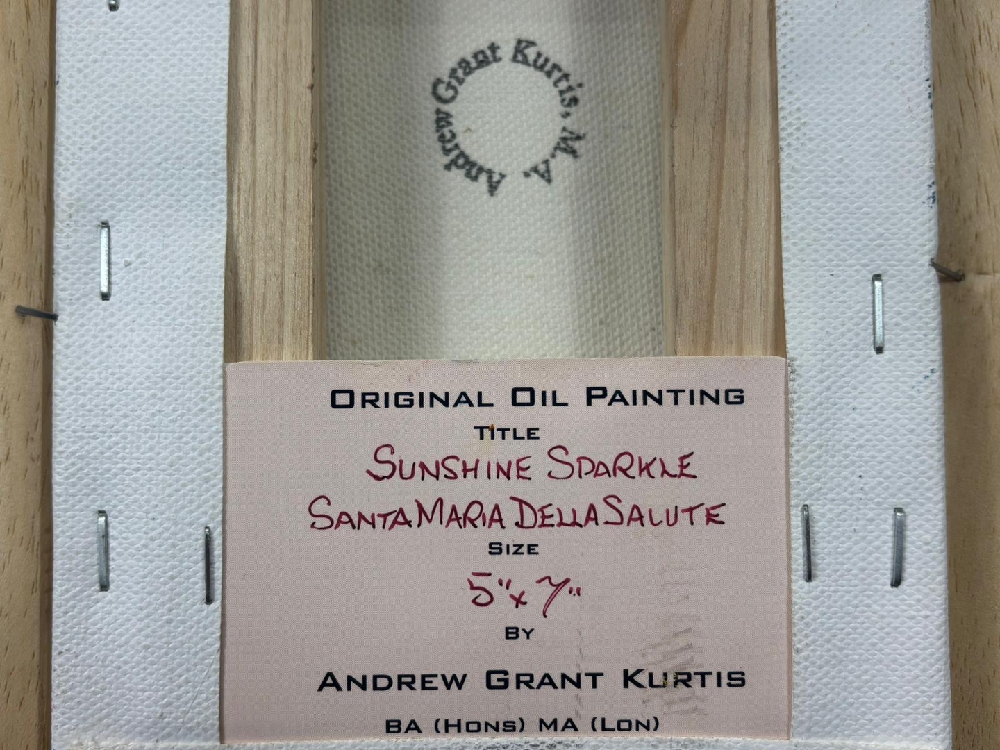 A framed original oil painting by Andrew Grant Kurtis titled 'Sunshine Sparkle Santa Maria Della Salute'. Approx 7" height, 5" width.