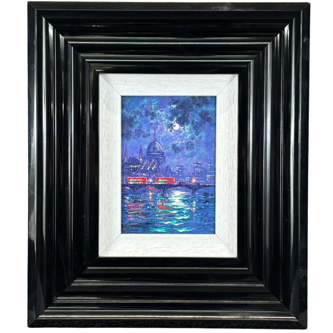 A compact and highly decorative artwork measuring approximately 7 inches in height and 5 inches in width, presented in a bold, substantial frame that enhances its visual presence. A collectible piece, ideal for admirers of London scenes and Kurtis’ distinctive nocturnal style.
