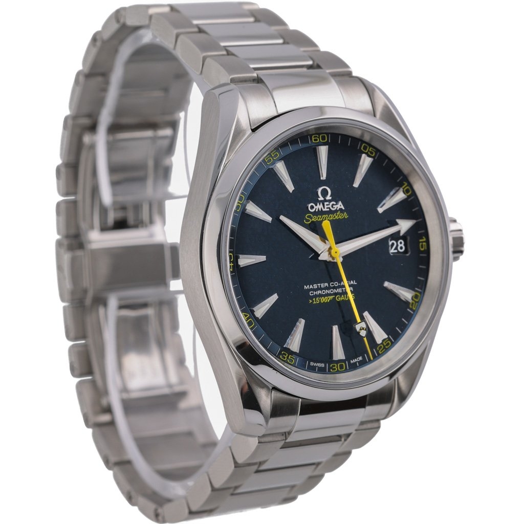 An Omega Seamaster Aqua Terra is a pinnacle of luxury and precision engineering. Crafted in immaculate stainless steel, this 2016 model features a 41mm case, striking the perfect balance between elegance and functionality. Its captivating blue dial, adorned with horizontal "teak" patterns inspired by yacht decks, exudes a maritime charm that complements its heritage. A robust yet refined design makes it equally suitable for formal occasions and everyday adventures.