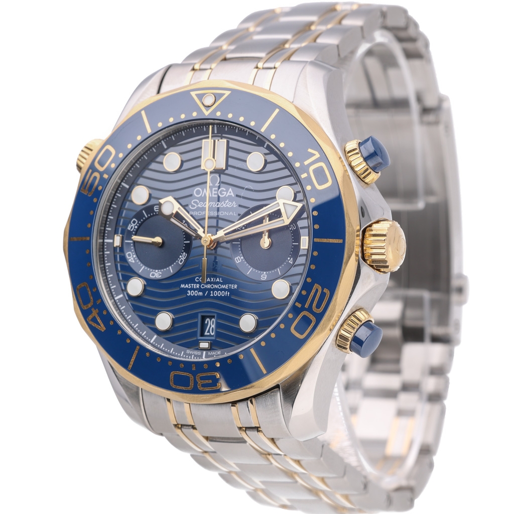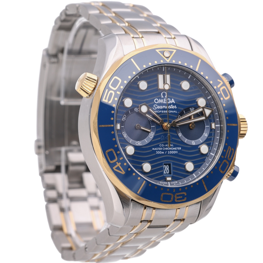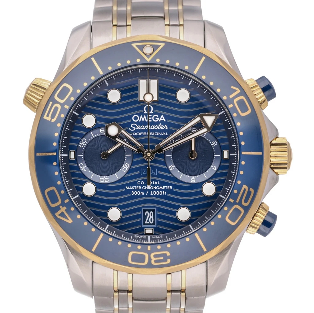 A bi-metal Omega Seamaster Diver 300M that brings together the strength of stainless steel and the luxury of 18ct yellow gold, paired with Omega’s signature deep-blue bezel and wave-pattern dial. Reference 210.20.44.51.03.001, this 2022 model delivers everything collectors love about the Diver 300M line — presence, precision and unmistakable Omega character.