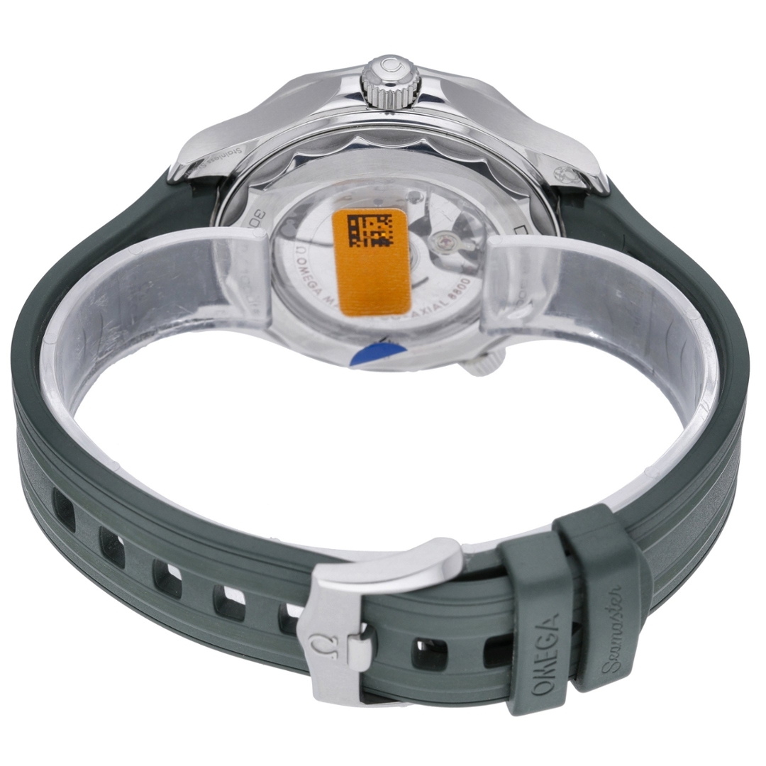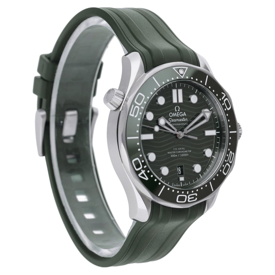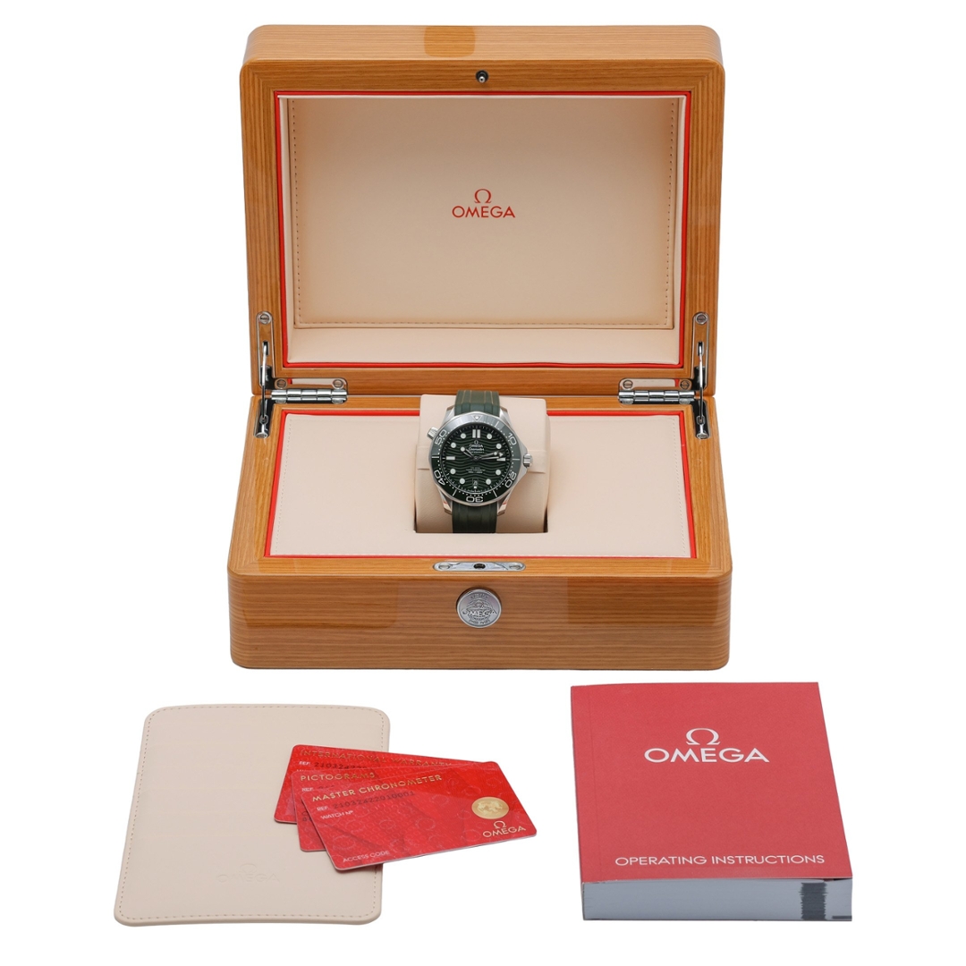 An Omega Seamaster Diver 300M, presented in a striking full-green configuration with matching green rubber strap, stainless steel case and clasp, and a green ceramic bezel and dial. Reference 21032422010001, this 2022 model captures everything collectors love about the modern Seamaster — bold colour, technical excellence and unmistakable Omega presence.