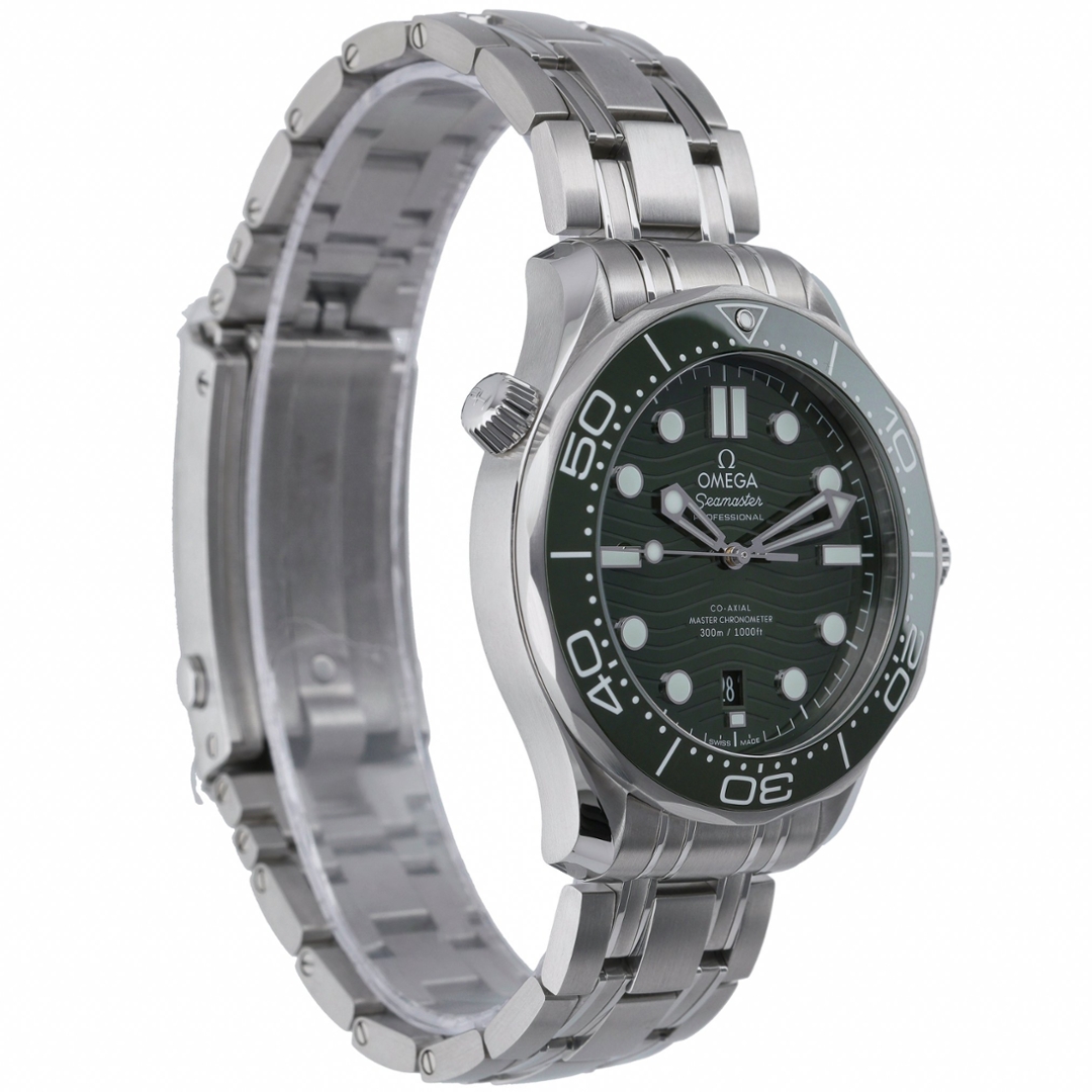 An Omega Seamaster Diver 300M is an immaculate example of one of the most distinctive modern colourways in the Seamaster line, presented in stainless steel with a rich green ceramic bezel and matching wave-engraved green dial. The combination of vibrant tone and crisp detailing gives the watch a contemporary character while remaining faithful to the heritage of the Diver 300M series, making it an effortlessly wearable piece for both daily use and more formal settings.
