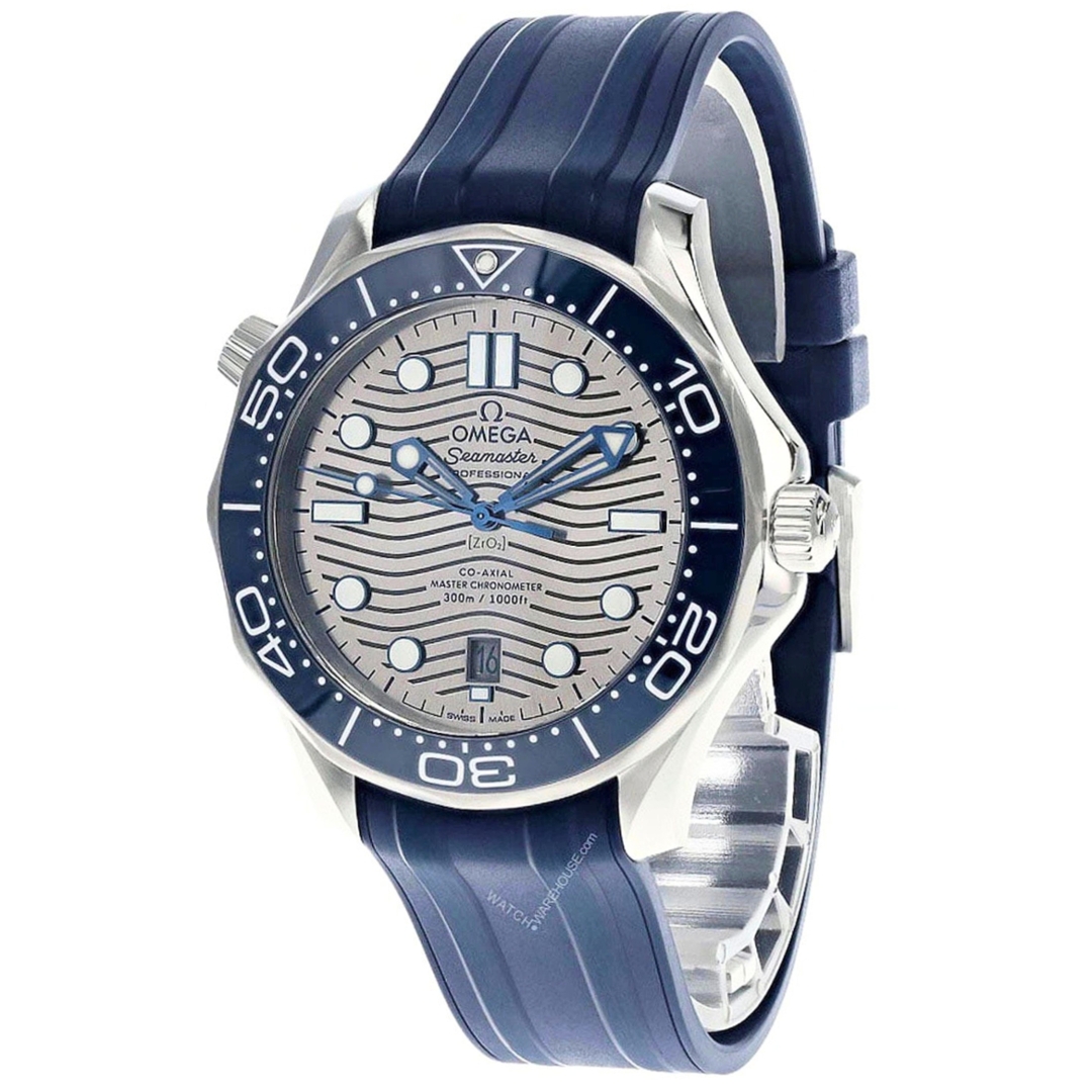 An Omega Seamaster Diver 300M, presented in stainless steel with a striking blue ceramic bezel and contrasting grey wave-pattern dial. The 42mm case delivers strong wrist presence, while the blue rubber strap enhances its sporty, contemporary appeal. The laser-engraved wave dial, paired with bold luminous markers and skeleton hands, reinforces the Seamaster’s iconic identity while offering excellent legibility in all conditions.