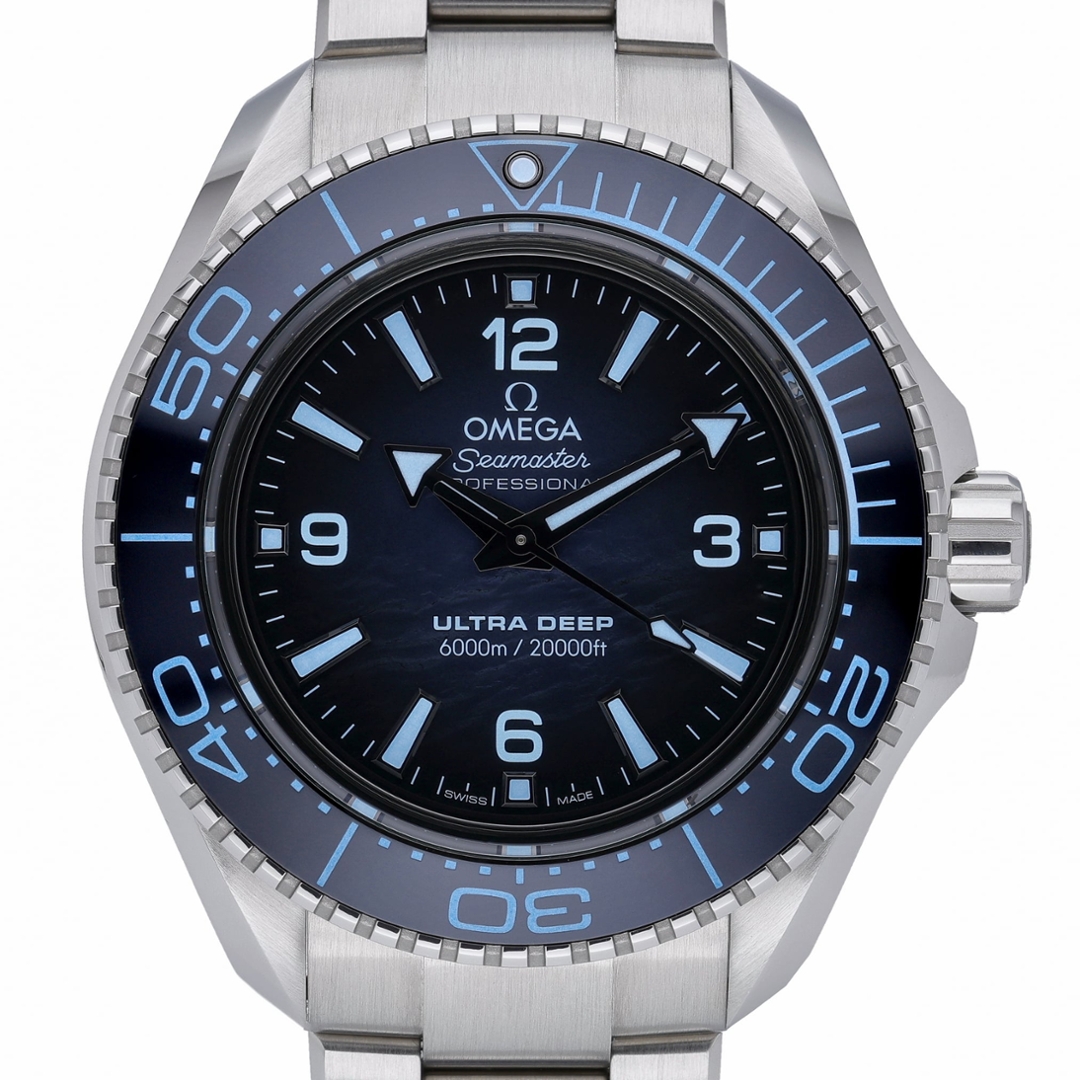 An Omega Seamaster Ultra Deep 6000M watch, model 215.30.46.21.03.002, crafted in stainless steel with a dark blue ceramic bezel and matching gradient blue dial. The substantial 45.5mm case is engineered for extreme performance, featuring a unidirectional diving bezel and bold luminous markers for maximum legibility in the harshest underwater conditions. The dial is marked “ULTRA DEEP 6000m / 20000ft”, reflecting its extraordinary depth rating and professional-grade capability.