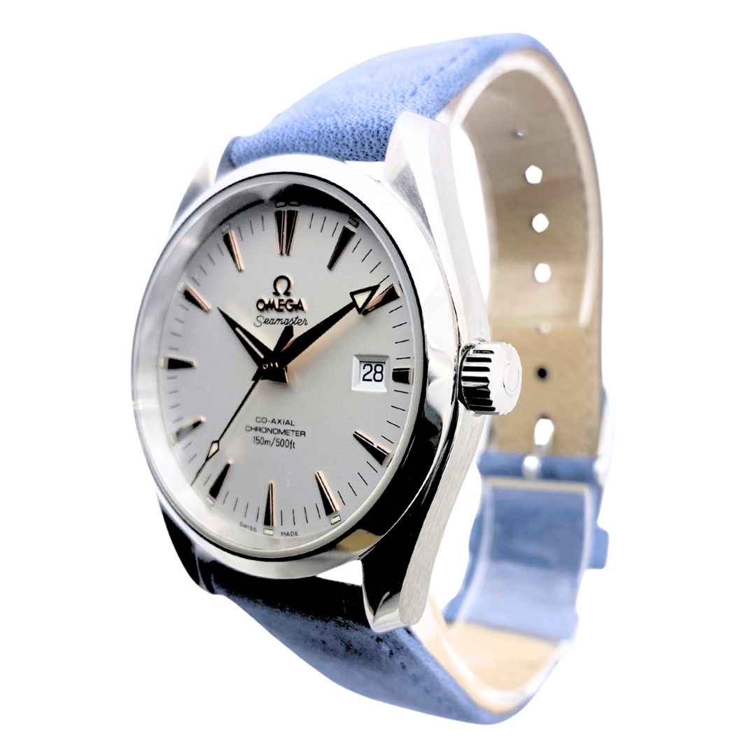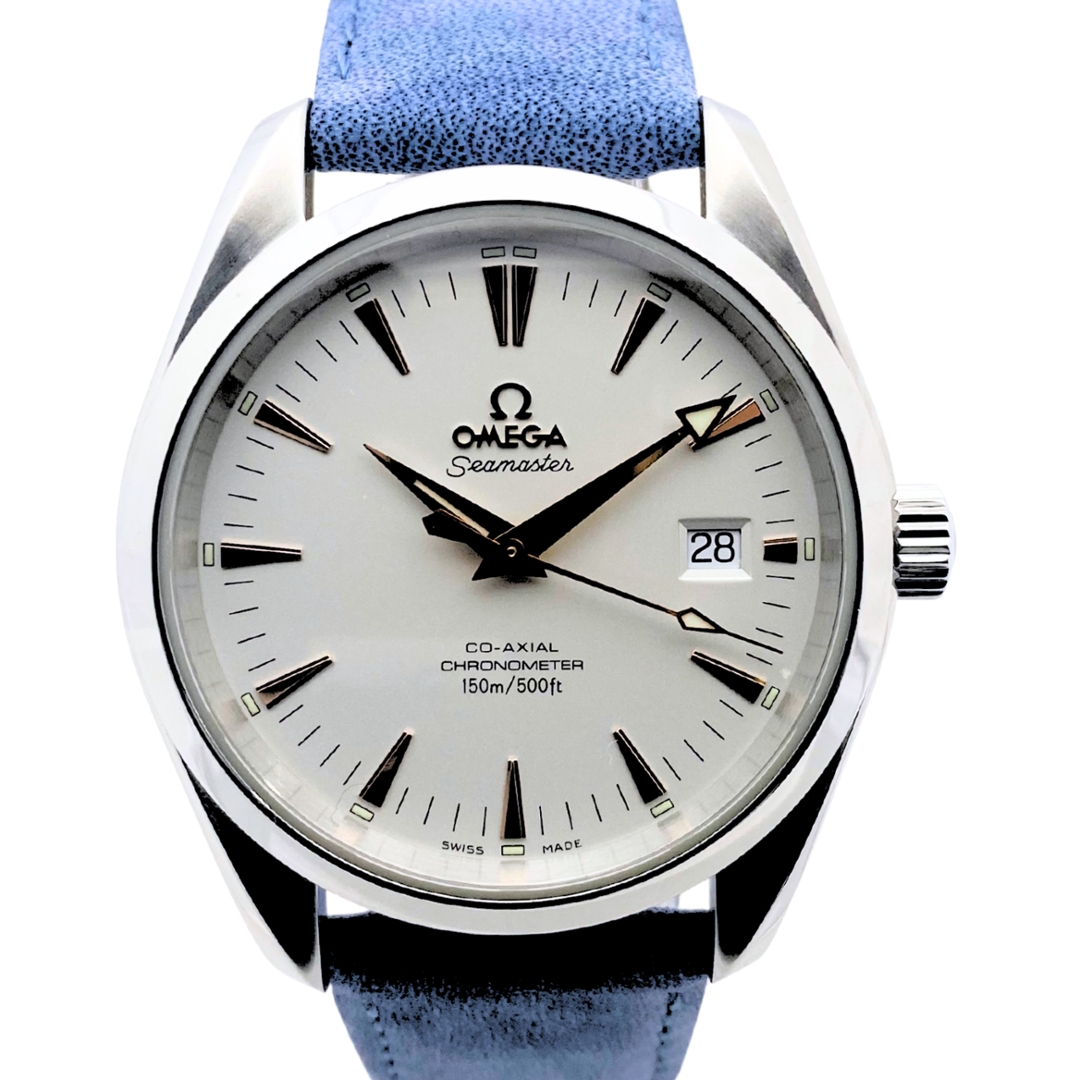 An Omega Seamaster Watch, Blue Leather Strap with a Stainless Steel Case & Clasp on a White Dial