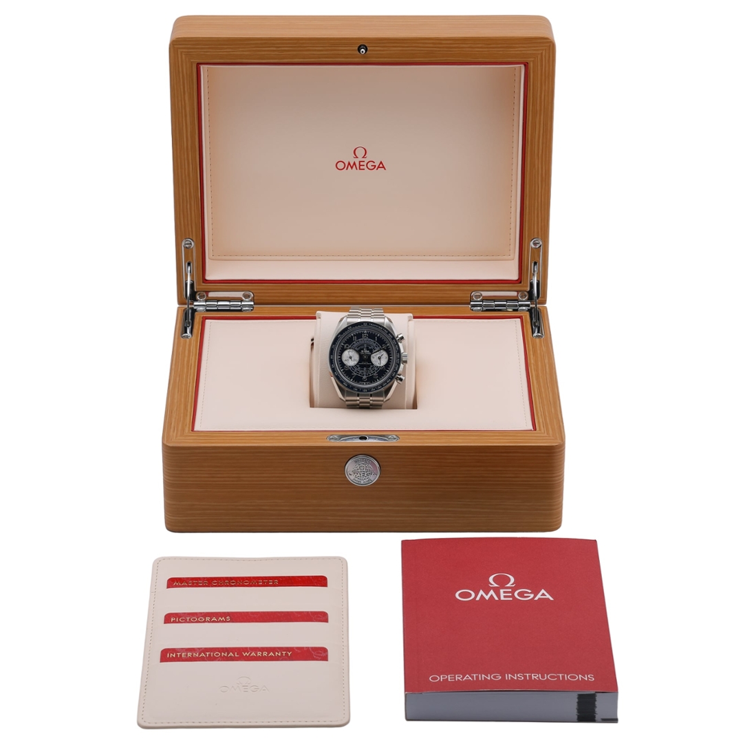 Dating to 2025, this example benefits from Omega manufacturer warranty coverage until 2030 and is offered boxed and certified, accompanied by original Omega paperwork. A technically impressive and visually distinctive Speedmaster that blends heritage chronograph design with modern Master Chronometer performance.