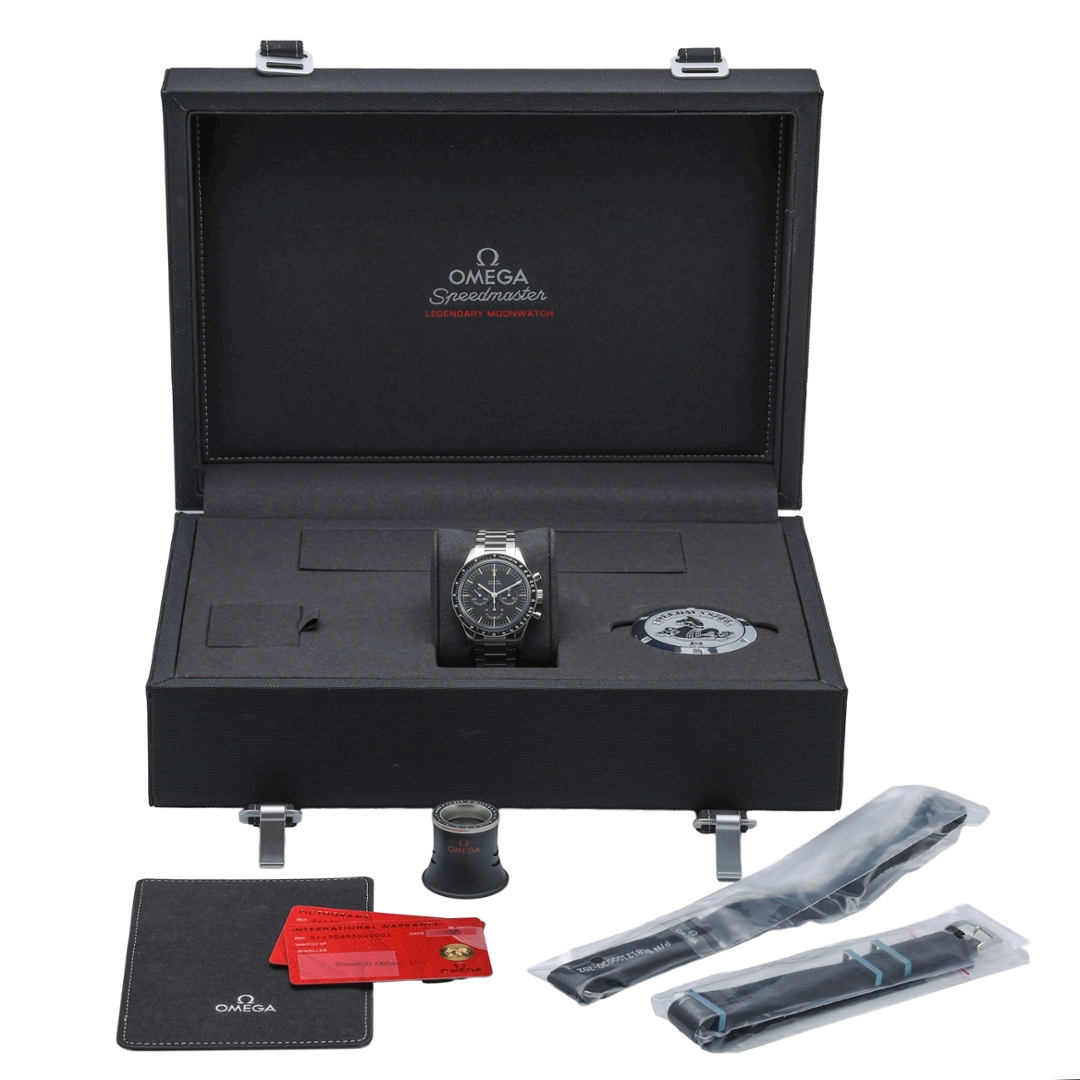 This timepiece is driven by a manual-wind movement and powered by the Co-Axial Master Chronometer Calibre 321, a historic movement meticulously restored by Omega. The dial is elegantly laid out with vintage-inspired sub-dials and slim baton hands, giving it a timeless, mission-ready appearance that speaks directly to the Speedmaster’s space-faring legacy.