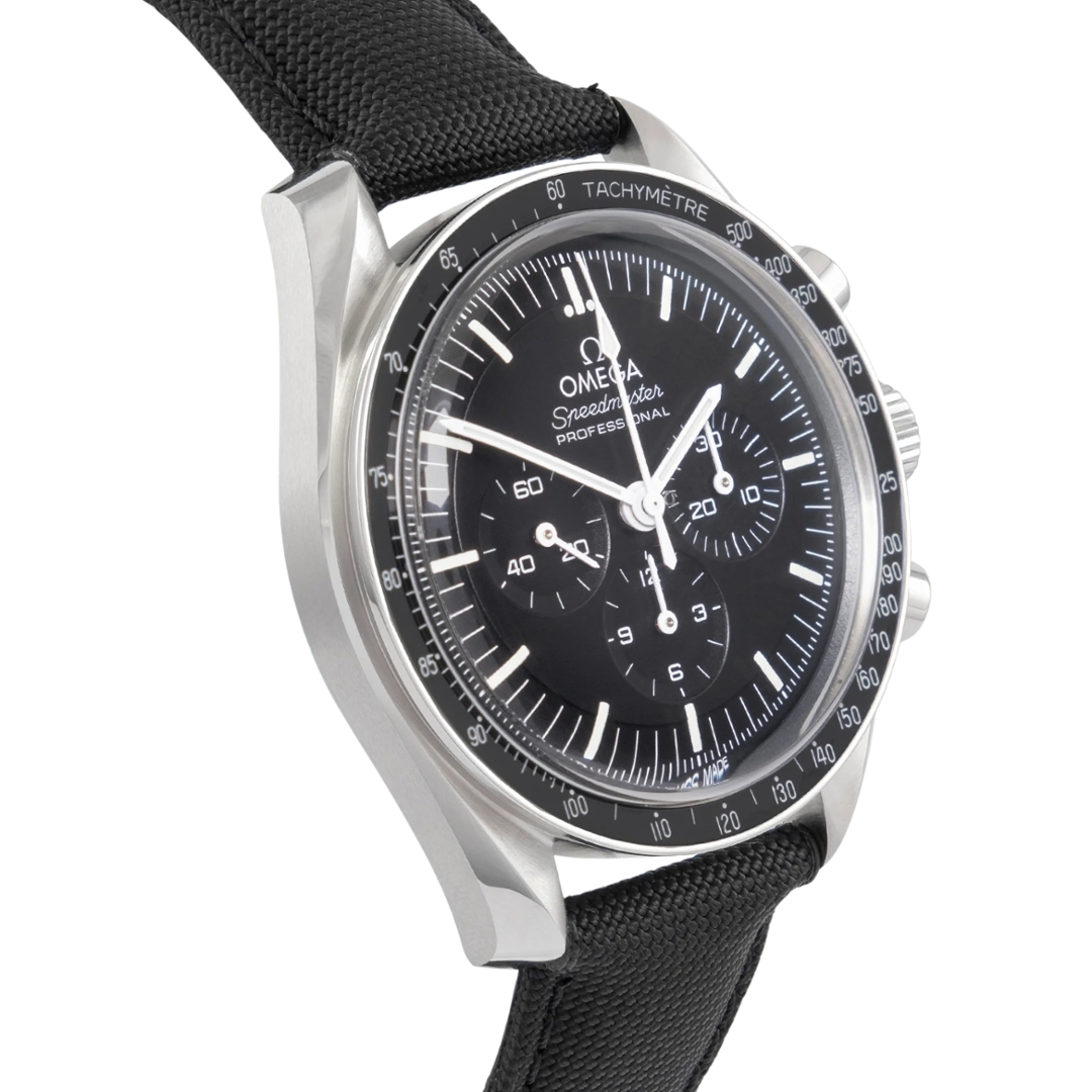 An Omega Speedmaster Moonwatch Professional, presented in stainless steel with a classic black dial and tachymetre bezel, paired with a black strap for a clean and purposeful finish. The 42mm case retains the iconic proportions that have defined the Speedmaster for generations, while the tri-compax chronograph layout and crisp white markers ensure exceptional legibility. This design remains virtually unchanged from the model worn during historic space missions, reinforcing its enduring appeal.