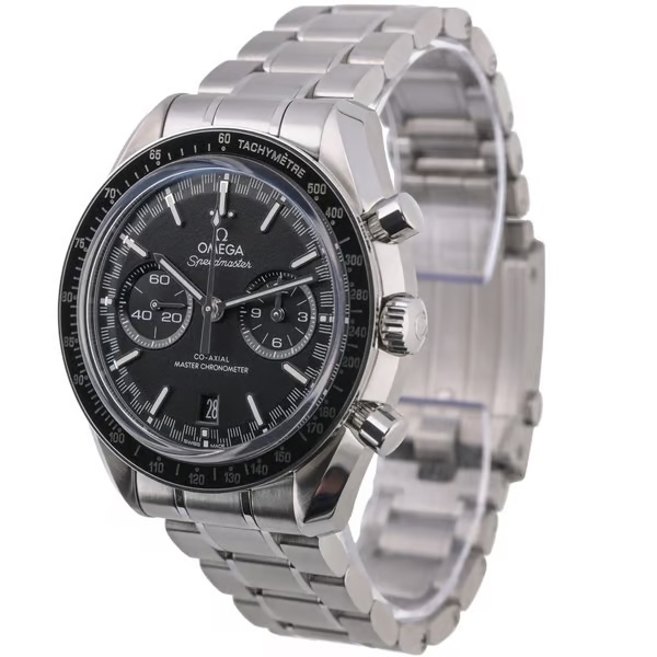 An Omega Speedmaster Racing, model number 329.30.44.51.01.001, is a striking timepiece that epitomises precision and style. Introduced in 2022, this watch boasts a robust 44mm stainless steel case, expertly designed to combine durability with elegance. Its sleek black bezel and matching dial create a bold aesthetic, enhanced by luminous hour markers and hands for optimal readability, even in low light.