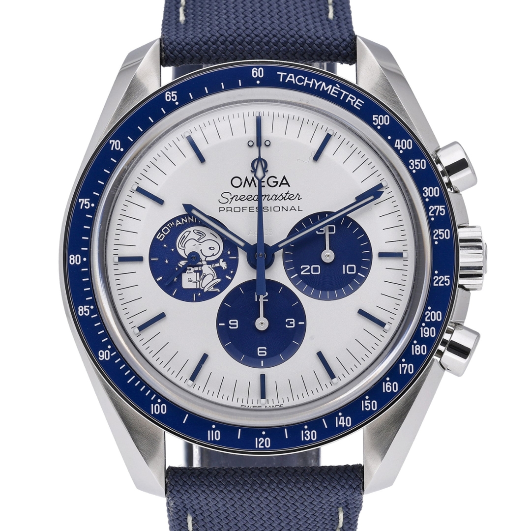 An Omega Speedmaster “Silver Snoopy Award” 50th Anniversary, reference 310.32.42.50.02.001, presented in stainless steel with its striking blue ceramic tachymetre bezel and crisp white dial. This 42mm 2024 example is offered in immaculate condition, showcasing the instantly recognisable blue sub-dials and the iconic Snoopy medallion within the 9 o’clock register. The contrast between the vivid blue accents and the silver-white dial gives this Speedmaster a distinctive, highly collectable character within the Moonwatch lineage.