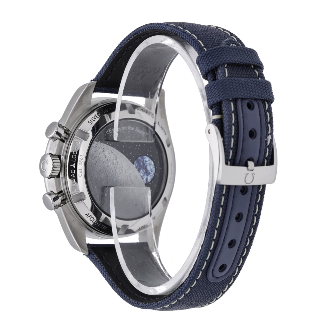 At its core is the Omega Co-Axial Master Chronometer Calibre 3861, a manual wind movement visible through the sapphire caseback. Certified by METAS, it offers exceptional precision, anti-magnetic resistance up to 15,000 gauss and a 50-hour power reserve. The caseback animation — where Snoopy travels across the lunar surface when the chronograph is engaged — pays tribute to Omega’s NASA heritage and the Silver Snoopy Award received in 1970 for its role in the Apollo 13 mission.