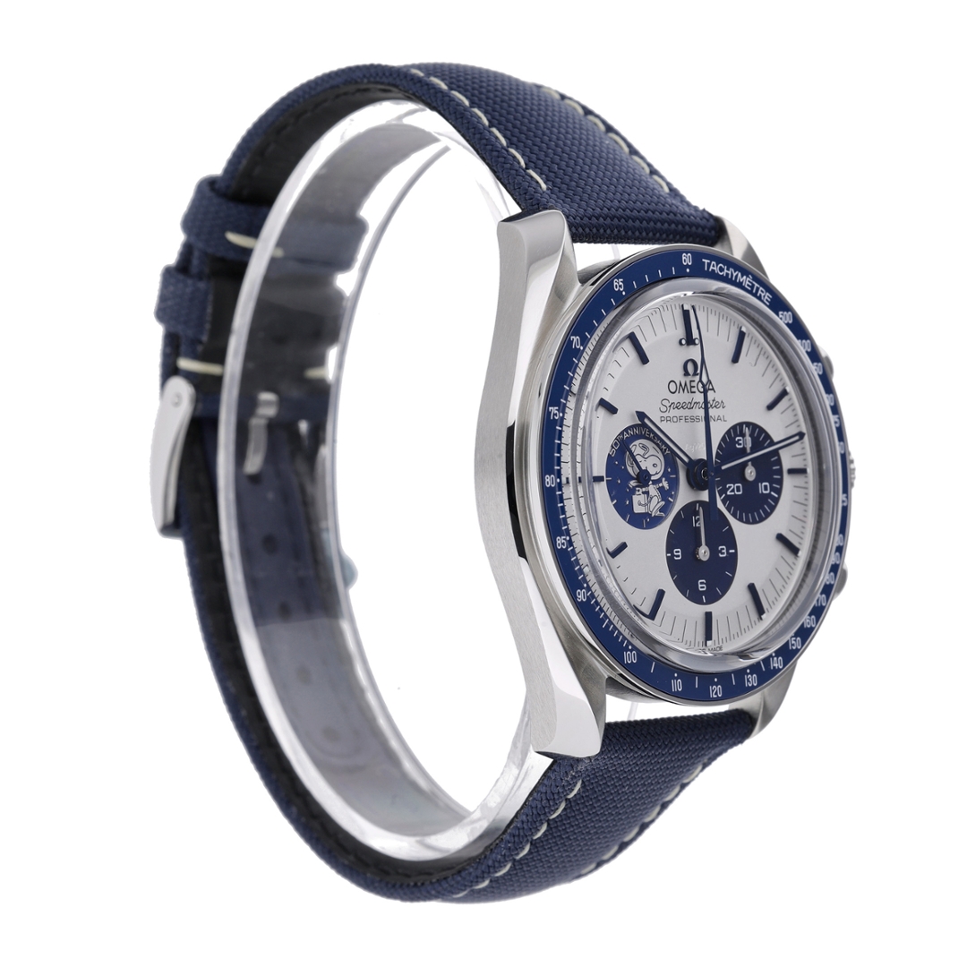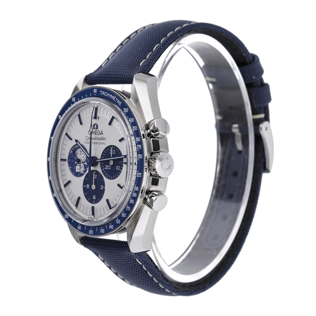 An Omega Speedmaster Snoopy Watch, Stainless Steel with a Blue Bezel on a White Dial